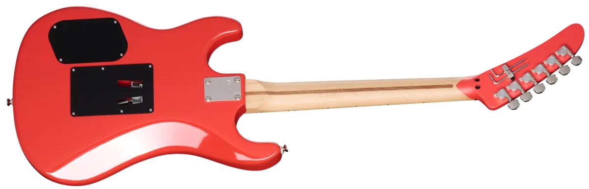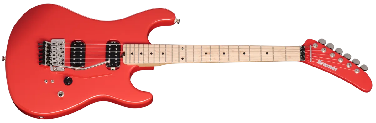 The Kramer 84 HH is an updated take on the legendary Kramer 84. While it has expanded features, we've kept all of the Made to Rock Hard Kramer attitude of the original intact. The Kramer 84 HH is equipped with an alder body with top and belly contours for comfort. The body has a Floyd Rose® 1000 Series tremolo paired with an R2 locking nut for vibrato bar acrobatics without the worry of going out of tune. The neck is a thermally aged bolt-on hard maple neck with a walnut skunk stripe on the back, a satin finish, and a hard maple fretboard that has 22 jumbo frets and black dot position markers. The neck has a Kramer SlimTaper™ C profile that is thin and fast-playing, making it perfect for shredding. The fretboard features a compound radius that is 10" at the nut and flattens out to 14" at the other end, sO playing first-position chords is comfortable while allowing for wide string bends further up the neck without the notes fretting out. The dual-action truss rod is adjusted with a spoke wheel-style truss rod adjustment nut, which is positioned at the end of the fretboard for quick access. The body's gloss finish color is duplicated on the front and back of the 84 non-angled big banana headstock. It has a classic Kramer logo, die-cast tuning machines, a nickel string retaining bar, and a wrench holder for the Floyd Rose on the rear, so you'll always have the tools to adjust the tremolo on hand. The updated electronics feature a pair of Kramer USA Eruption pickups that were designed by Gibson Master Luthier Jim DeCola. Instead of using mounting rings, the pickups are screwed directly into the body for enhanced sustain. A 3-way toggle pickup selector switch lets you use either pickup by itself or run them together, and two mini toggle switches (one for each pickup) are provided for coil splitting, giving you both humbucker™ and single coil tones that you can combine at will. A single master volume control with a retro-style black knurled knob controls the output level of both pickups simultaneously, making overall volume adjustments easy. A Kramer premium gig bag is included with the Kramer 84 HH to keep this instrument of sonic mayhem safe when you're traveling to your next gig.