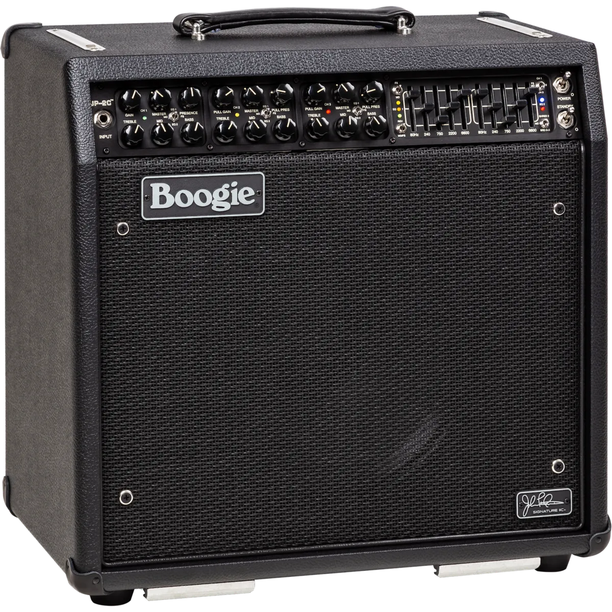 Much like a race car or fighter jet, the JP-2C strips down to bare essentials to get the job done effectively and in the simplest way. It's a purpose-built, no-compromise rendering that aims at one single goal; provide the most aggressive, purest sounding lIC+ in a versatile package that delivers the goods to meet John's recording and stage needs. The JP-2C offers the highest headroom Clean sounds of any Mark Series amp, one Boogie Lead Channel for tight, grinding rhythm work, and a slightly higher gain Boogie® Lead Channel, with access to even more saturation yet the ability to track any technique and speed while also reaching to the stratosphere for single note solos. In that spirit, unlike other MESA amplifiers, the JP-2C foregoes the concept of multiple voicing Modes per channel and instead dedicates each of the three Channels exclusively to one of two voicings from the MARK IIC+. In Channels 2 and 3, it also adds a SHRED Mode, which further enhances the top-end harmonic layering of the original lIC+ Lead Circuit.