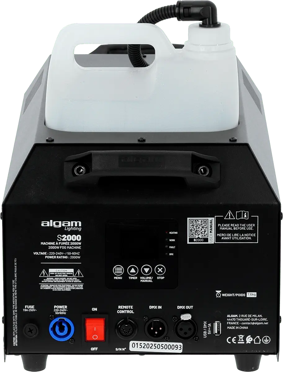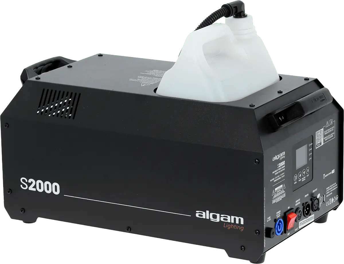 Thanks to its 5-liter tank, the S2000 offers extended autonomy for long performances without interruptions. The included adapter cap allows you to use Algam Lighting 5-liter smoke fluid canisters directly, avoiding unnecessary handling and reducing refill time. This setup simplifies logistics and ensures continuous operation, even during intensive events.