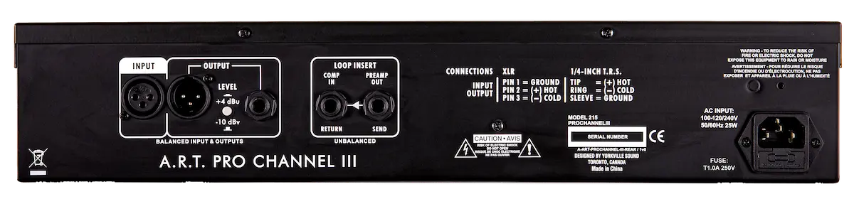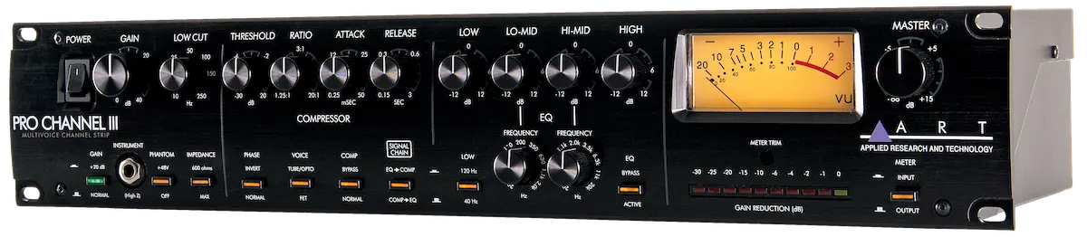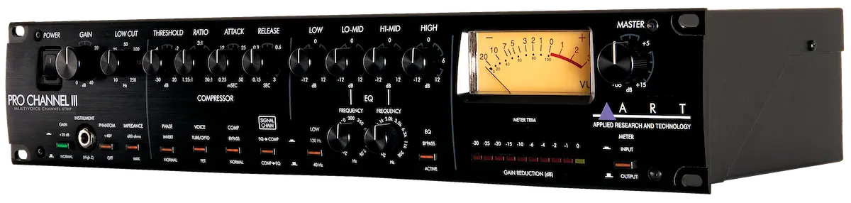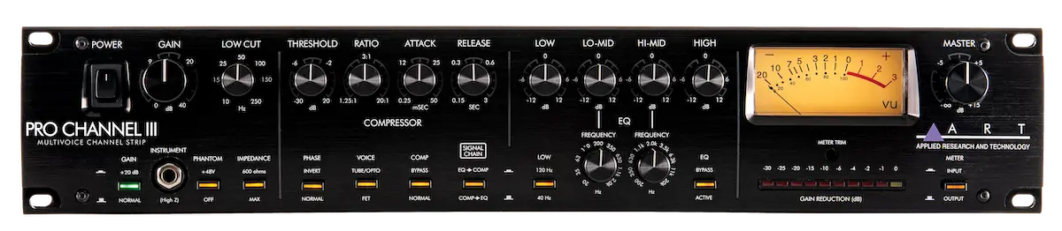The ART Pro Channel III is a channel strip With selectable microphone impedancer two compression voicings, and semi-parametric EQ. lt was designed for recording musicians seeking an affordable character preamp With extensive tone shaping and real tube warmth. Mic & Instrument Preamp The Pro Channel III features a discrete FET input stage and up to 60 db of preamp gain. Switchable impedance optimizes the input for various microphones, and the variable Iow cut filter can eliminate rumble, tame plosivesr and tighten bass. lt's also a versatile instrument Dl. Connecting to the front 1/4" input Will override the rear XLR input, so you can record direct tracks without disconnecting your mic/line signal. Opto & FET Compression The compressor section features variable threshold, ratio, attack, and release controls, and can be placed before or after the EQ section in the signal path. Press the Voice button to switch between smooth tube/opto and punchy FET compressor modes. Versatile Tone Shaping The equalizer section features a switchable Iow shelf frequency, variable Iow-mid and high-mid frequencies With over 4 octaves of range per band, and a 12 kHz high shelf that can soften sizzle or boost brilliance, so you can sculpt and enhance any source.