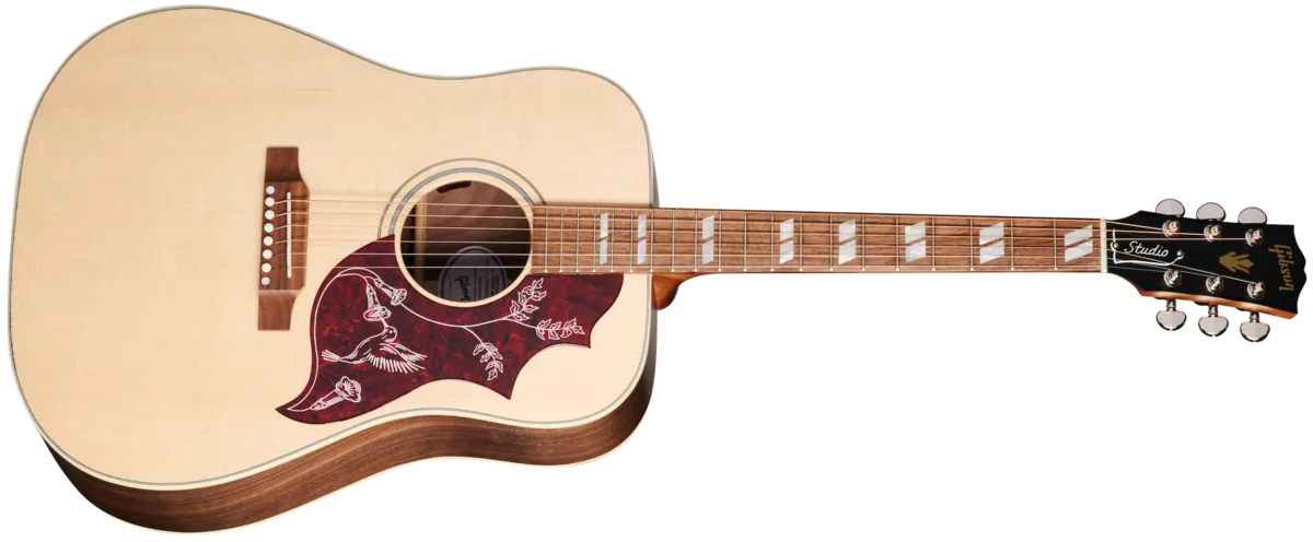 The Hummingbird™ Studio Rosewood continues Gibson's long history of producing world-famous square shoulder body designs, such as the Hummingbird, Dove™, and Songwriter models. The Hummingbird Studio Rosewood is handcrafted in Bozeman, Montana, using all-solid tonewoods, including a gloss nitrocellulose lacquer-finished Sitka spruce top for wide dynamic range, playing responsiveness, and balanced tone. The satin nitrocellulose lacquer-finished rosewood used for crafting the back and sides delivers a bit more rich-sounding bass and sparkling treble overtones than the traditional mahogany-bodied Hummingbird models. The Hummingbird Studio Rosewood's full-depth body ensures rich, deep tone and excellent volume and projection. The Hummingbird Studio Rosewood is equipped with an Advanced Response profile and satin nitrocellulose lacquer-finished utile neck for smooth, easy playability. The Advanced Response neck profile sits in between some of the other Gibson neck profiles and is not too large or too thin but sits "just right" in the hand for many players. The rosewood fretboard has 20 standard-sized frets and is adorned with the classic mother-of-pearl parallelogram inlays that are one of the visual hallmarks of the classic Hummingbird design. The fretboard's 16" radius makes playing fast passages easy and efficient, contributing further to the model's excellent playability. You'll find yourself reaching for this guitar again and again since playing it is so enjoyable. The headstock is equipped with smooth-turning Grover® Rotomatic® tuning machines and a Graph Tech® TUSQ® nut for excellent tuning stability SO you can spend more time playing and less time tuning. The saddle and bridge pins installed on the rosewood bridge plate are also TUSQ. The Hummingbird Studio's pickguard graphics deliver another classic Hummingbird visual touchstone. The Hummingbird Studio Rosewood has an L.R. Baggs™M Element Bronze active under-saddle piezo pickup with a quick-to-access soundhole-mounted volume control for easy studio-quality plug-and-play anywhere. Packaged in an included hardshell case for portability and protection, the Hummingbird Studio Rosewood is ready to join you wherever your muse takes you.