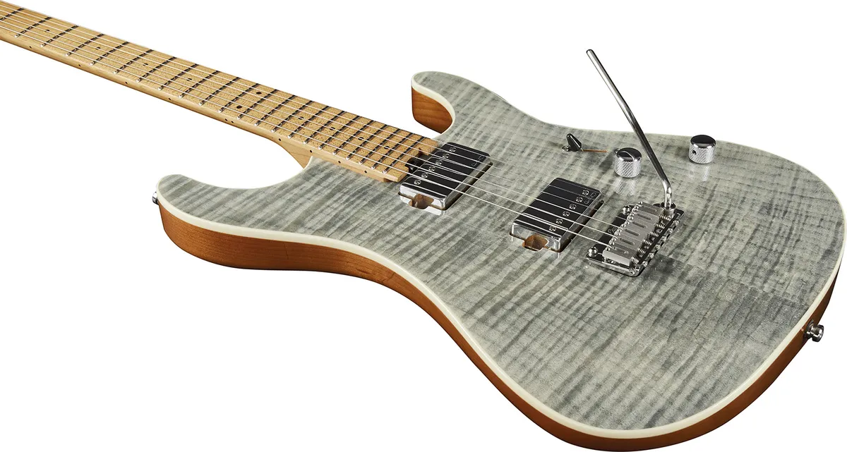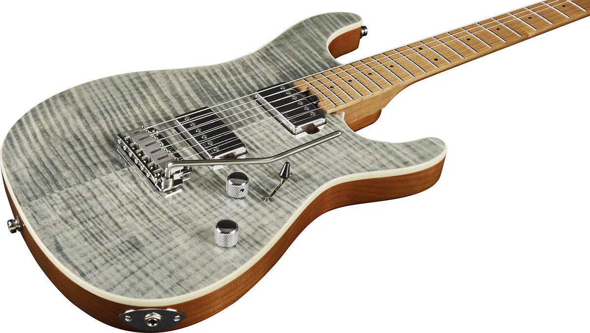 Musa guitars are crafted to the highest standards, to inspire guitarists and enable them to express their very best with comfort and performance. The body is made of solid alder, topped by a flamed Canadian maple top. The sturdy, comfortable 5-point screwed roasted maple neck is topped by a 22-fret roasted maple fingerboard, with a 628 mm scale, for added playing comfort. The Eko Steel HRC57 tremolo features independently adjustable saddles to fine-tune the action and harmonics of each string. Its locking tuners in 4+2 configuration ensures tuning and note stability. Finally, the glossy grey color is present on the top body, as well as on the front of the headstock, to elegantly magnify the flamed maple.