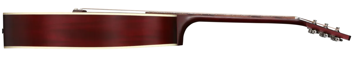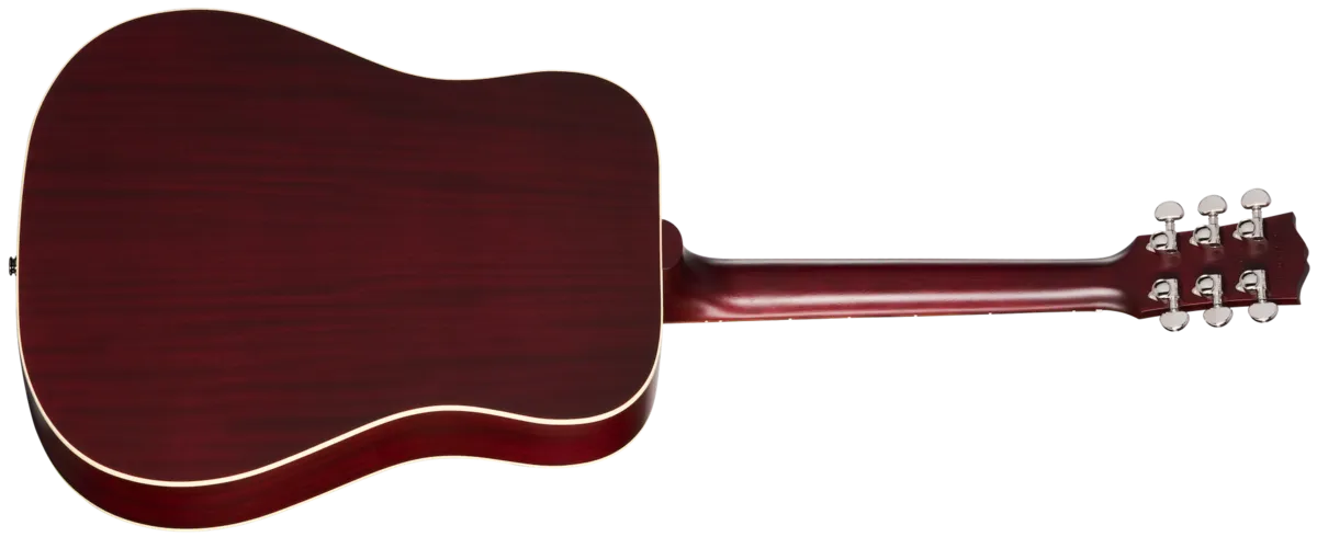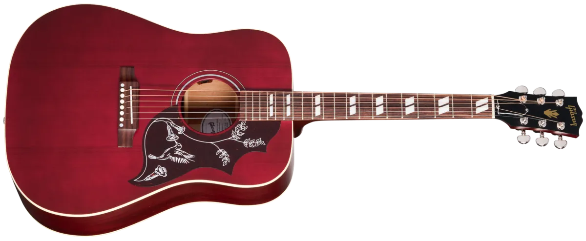First introduced in 1960, the Gibson Hummingbird ™ is one of the most distinctive and well-loved acoustic guitars ever made. Handcrafted with care in Bozeman, Montana, by Gibson's expert acoustic luthiers, the new Gibson Hummingbird Special offers players a USA-built Gibson Hummingbird model at a very attractive price. The Hummingbird Special has a traditional square-shouldered body constructed using genuine solid mahogany for the back and sides and a solid Sitka spruce top that is reinforced with our traditional scalloped X-bracing. This combination of tonewoods delivers a warm, balanced tone with excellent dynamic range that is perfect for any style of music. The "concert depth" body is slightly thinner than the body on a Hummingbird Standard, giving it a leaner and tighter bass response that sits perfectly in the mix and also makes it easier to hold. The utile neck is attached to the body with a compound dovetail neck-to-body joint, and like all Gibson acoustic guitars, it is affixed with hot hide glue. The neck has a comfortable Round profile, and the rosewood fretboard has a 12" radius and features pearloid parallelogram inlays, which is one of the visual hallmarks that makes the Hummingbird easily recognizable. The fretboard is fitted with 20 standard frets. The traditional belly-up rosewood bridge is equipped with a TUSQ® saddle, and the nut and bridge pins are also TUSQ. High-quality Grover® Rotomatic® tuners ensure rock-solid tuning stability. The pickguard features a simplified version of the world-famous Hummingbird pickguard graphics. The Hummingbird Special is finished in satin nitrocellulose lacquer in your choice of Satin Vintage Cherry Sunburst and Satin Wine Red. It comes equipped with an L.R. Baggs™ Element Bronze under-saddle piezo pickup and active preamp with an easily accessible soundhole-mounted volume control, so it's stage and studio-ready from the moment you take it out of the included premium soft shell case.