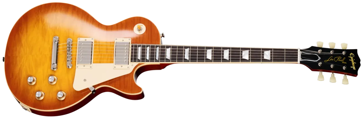 The 1960 Gibson Les Paul ™ Standard is one of the world's most coveted vintage guitars. It has been embraced by such luminaries as Eric Clapton, Paul McCartney, and Joe Walsh. The 1960 Les Paul Standard is very similar to the famous 1959 model year that preceded it, but with a few changes, most notably, a thinner and faster-playing Slim Taper™ neck profile that many players prefer over the somewhat beefier 1959 Les Paul Standard neck profile. Now, Epiphone iS proud to introduce the Epiphone 1960 Les Paul Standard Reissue, a beautiful recreation of those vintage 1960 Les Paul Standard models. Made in partnership with Gibson Custom, the Epiphone Les Paul Standard 1960 Reissue delivers vintage Les Paul looks and performance at an accessible price. All of the classic appointments the 1960 Les Paul Standard model is known and loved for are present here, including a one-piece mahogany neck with a long neck tenon for increased stability and sustain, a comfortable, fast-playing SlimTaper™ profile, and a bound rosewood fretboard. It also features mother-of-pearl trapezoid fretboard inlays, an aged mother-of-pearl Epiphone headstock logo, and the words "Les Paul Model" silkscreened in gold on the Gibson-style "open book" headstock. Even the side dot position markers are the same size as on vintage 1960 Les Paul Standard models and are placed in historically accurate locations. The genuine mahogany body features a carved maple cap that is topped with a beautiful AAA flamed maple veneer. The electronics are equally impressive, with two USA Gibson Custombucker humbucking pickups with Alnico 3 magnets that are hand-wired to CTS® potentiometers, Black Beauty paper-in-oil capacitors, and a Switchcraft® pickup selector toggle switch and output jack. The Vintage Gloss finish gives the guitar a vintage appearance without looking overly aged and is nicely complimented by the nickel hardware, including the Epiphone Deluxe "Double Ring" Keystone button tuners. A Brown hardshell case with Inspired by Gibson Custom graphics and a pink plush-lined interior is also included. This is the perfect Les Paul for players who love the vintage appeal of the classic 1959 Les Paul Standard but who want a more comfortable neck profile.