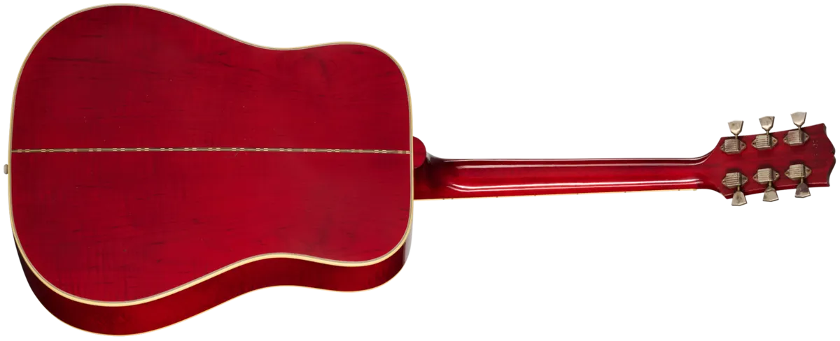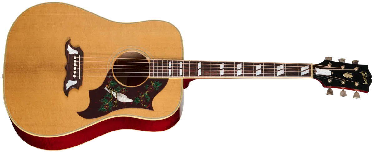 The Gibson Dove™ was first introduced to the world in 1962 at the dawn of one of the most revolutionary and impactful decades in popular music history. It was the second Gibson square shoulder acoustic model, following the Hummingbird ™ which was first released two years earlier, in 1960. Over sixty years after its introduction, the Dove remains one of the world's most popular, instantly recognizable, and iconic acoustic guitars. The Dove has been seen in the hands of some of the biggest names in music, including Tom Petty, Elvis, Alex Lifeson, John Mellencamp, and Frank Hannon, just to name a few. Now, Gibson Custom is very proud to introduce the 1963 Dove Light Aged, a faithful recreation of the early Dove models, masterfully aged by the artisans of the Murphy Lab to give it the look and feel of a well-loved vintage example. The 1963 Dove Light Aged has a thermally aged Sitka spruce top with traditional scalloped X-bracing to help give it the tone of a well-seasoned vintage guitar and beautifully flamed maple back and sides that are finished in Cherry. The mahogany neck has a comfortable Round profile and is topped with an Indian rosewood fretboard that is equipped with 20 standard frets and adorned with mother-of-pearl parallelogram inlays. The longer scale length of 25.5", coupled with the maple body, gives the Dove a distinctive tone that is somewhat louder and a bit brighter and fuller than the Hummingbird's more midrange-focused tone. The Dove's headstock has the Gibson logo and crown inlays in mother-of-pearl and is equipped with high-quality nickel Kluson® Waffleback tuners and a black-bordered white truss rod cover with DOVE lettering. The nut is bone, as are the saddle and bridge pins. The saddle is fitted into an iconic Dove rosewood bridge plate that is fitted with two mother-of-pearl dove inlays. The instantly identifiable Dove pickguard is decorated with stamped vines and flowers and a mother-of-pearl dove. The 1963 Dove Light Aged features Light Aging by the skilled artisans of the Murphy Lab. The Murphy Lab Light Aged finish treatment, paired with lightly aged hardware, simulates decades of light play wear, giving it the unique character, vibe, and feel of an original example from the Gibson Golden Era. It comes packed in a vintage-style black hardshell case to complete an authentic vintage playing and ownership experience that only Gibson Custom and the Murphy Lab can provide.