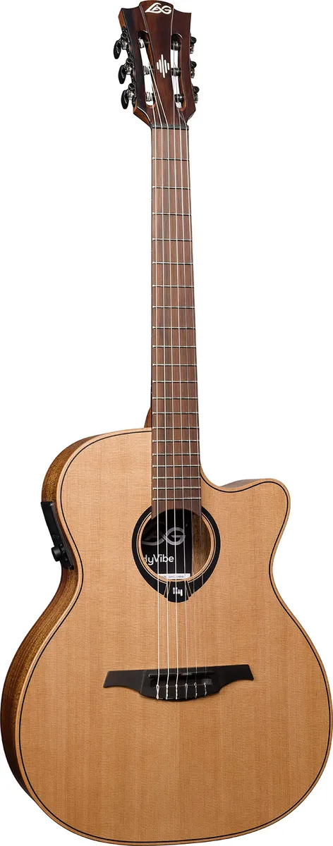 The HV10-N-ACE brings the warmth of nylon strings to the HyVibe smart guitar family. Its solid red cedar top enhances the natural, mellow tones of nylon strings, while the Khaya mahogany back and