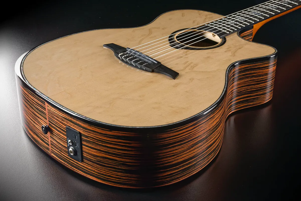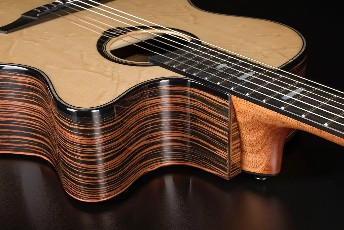 perfectly complemented by the richness of Macassar ebony back and sides. Designed for classical and modern players alike, its cutaway shape ensures easy access to higher frets, while the ergonomic