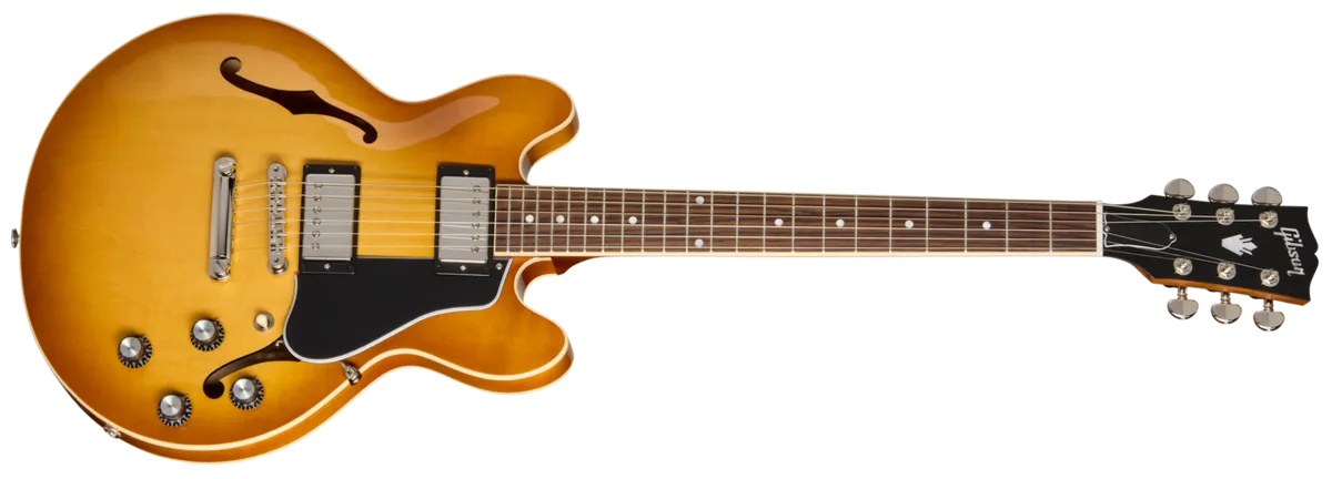 The Gibson ES-339 is a modern classic designed for those seeking the tone and look of an ES-335, but desire a slightly smaller, lighter instrument. The pearloid dot inlay rosewood fingerboard on a hand-rolled Rounded "C" mahogany neck remind players where it all started. The 57 / 57 Classic + humbuckers paired with our hand-wired tone circuit showcases the versatile Gibson ES tone that players have craved for over 60 years. Tuning stability and precise intonation are provided by the Grover Rotomatic tuners with Kidney buttons paired with light-weight Aluminum ABR-1 bridge and Stop bar tailpiece.