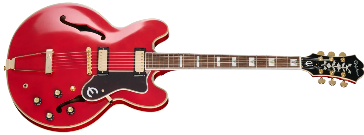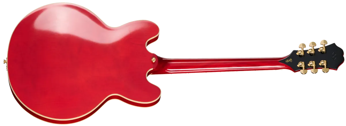 Gem Archer, the versatile guitarist from Oasis, Beady Eye, and Noel Gallagher's High Flying Birds, is known, in part, for using an Epiphone Sheraton ™, which Noel gifted to him. Now, Epiphone is proud to introduce the Masterbilt Gem Archer Sheraton, a new artist model based on that original Sheraton that Gem still regularly uses. The Sheraton is an original Epiphone design that was first introduced in 1958. This Masterbilt semi-hollowbody guitar, with its distinctive and elegant styling, represents the highest standards of build and componentry for Epiphone. The Masterbilt Gem Archer Sheraton is built to the same standards as our Inspired by Gibson Custom models and includes the same etched Double Diamond on the headstock rear that can be found on those instruments. The Masterbilt Gem Archer Sheraton features a semi-hollowbody, 5-ply layered maple/poplar body with a maple centerblock for added sustain and improved feedback resistance. The body's top and back are multi-ply bound, as are the headstock and fretboard. The one-piece mahogany neck has a comfortable 60s C profile and is topped with a rosewood fretboard that is equipped with 22 medium jumbo frets and adorned with attractive mother-of-pearl block and abalone triangle inlays. The large, 60s-style Sloped Dovewing headstock has the historic Epiphone logo and Tree of Life inlaid in mother of pearl. All of the hardware on this Sheraton is gold, while the finish is a beautiful Vintage Gloss. The headstock is equipped with smooth-turning Grover® Rotomatic® tuning machines with Milk Bottle buttons, which, along with the low-friction Graph Tech® nut, help to keep the guitar solidly in tune. An ABR-1 bridge and Casino M-style raised diamond trapeze tailpiece hold the strings down at the other end. The electronics are first-rate, consisting of a pair of USA-made Gibson Mini Humbucker™ pickups paired with individual volume and tone controls that utilize high-quality CTS® potentiometers and Mallory ™ capacitors and routed through a Switchcraft® three-way pickup selector toggle switch and 1/4" output jack. Available in both right and left-handed versions, an Epiphone hardshell case completes the package and helps to keep this beautiful guitar safe when you're traveling to your next performance.
