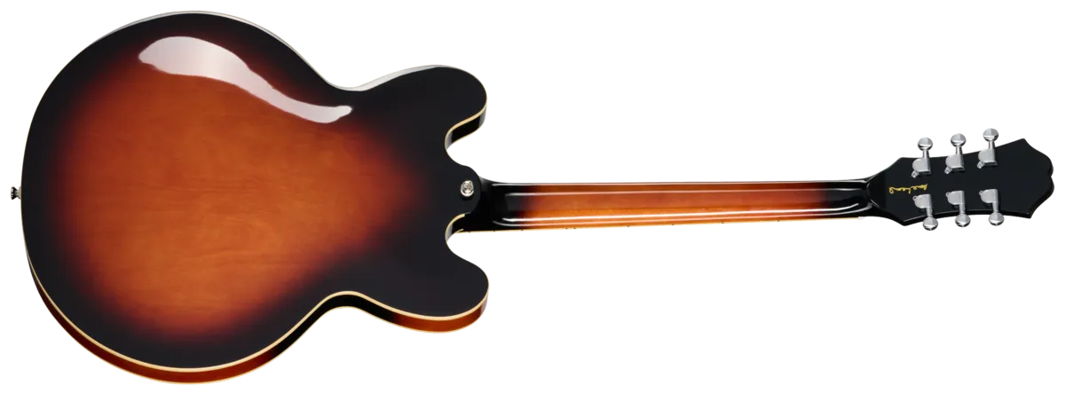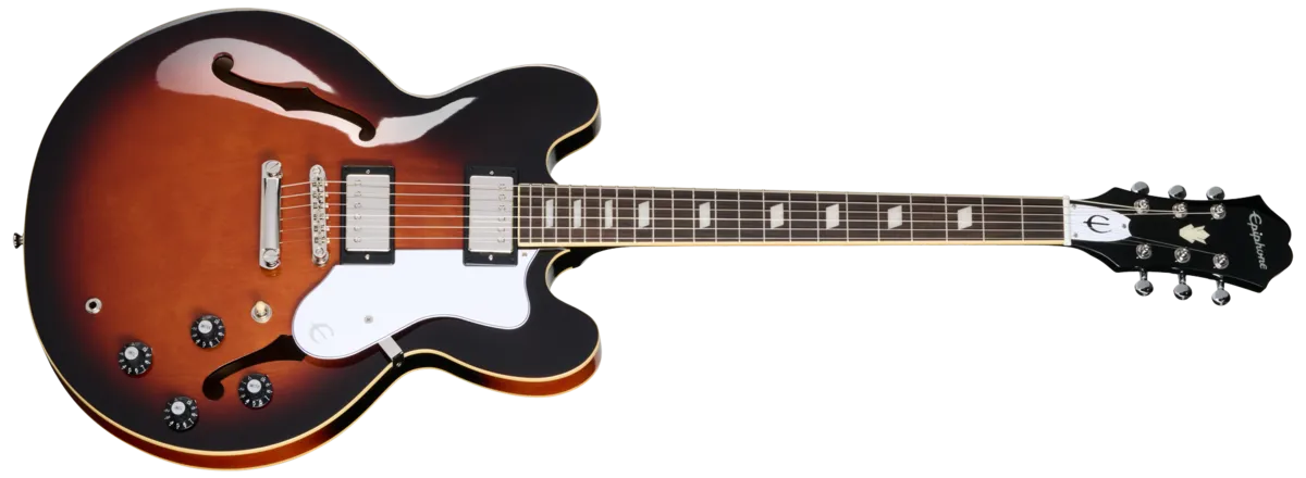 The new Epiphone Bonehead Riviera has a five-ply layered maple body with a solid maple centerblock for improved sustain and feedback resistance. The body has single-ply cream binding on the top and back. The three-piece maple neck has a SlimTaper™ C profile and a volute and is capped with a bound rosewood fretboard that is outfitted with 22 medium jumbo frets and adorned with pearloid parallelogram inlays. The Epiphone Sloped Dovewing headstock is equipped with premium die cast tuners with the E logo and oval metal buttons, a low-friction Graph Tech® nut, a two-ply crescent bullet truss rod cover with E logo, and an Epiphone logo and Gibson Crown inlaid in mother of pearl. There is also a Bonehead signature reproduction on the headstock rear in gold. The Epiphone Bonehead Riviera is powered by a pair of Epiphone's acclaimed Alnico Classic PRO M pickups. They are wired to individual volume and tone controls that utilize high-quality CTS® potentiometers, and the knobs are black witch hats with silver inserts. Dial pointers are included, so you'll always know how things are set with just a glance. A hardshell case is also included, ensuring safe storage and transport whether you're going to a jam at a friend's house or leaving for your latest national tour.