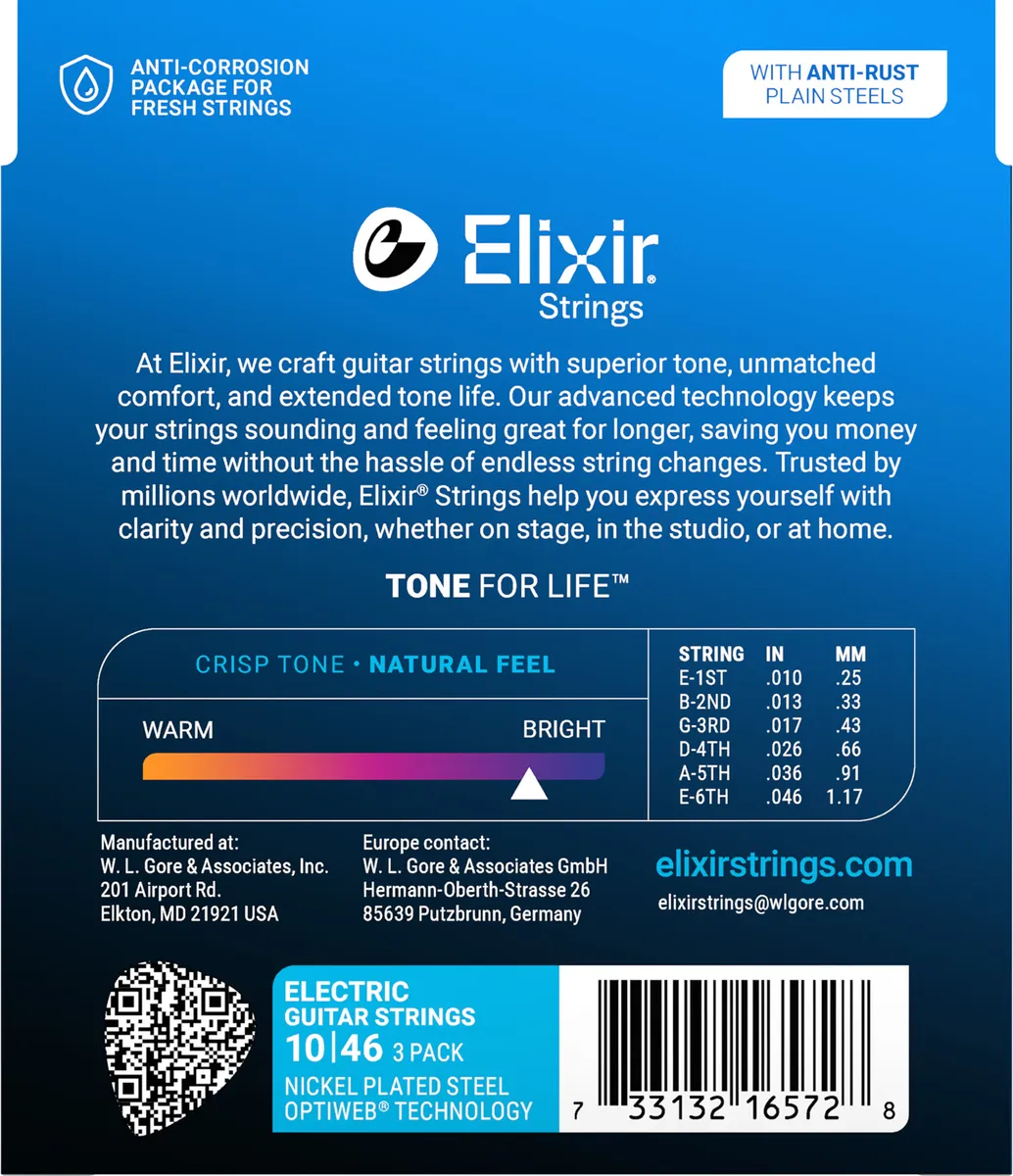 Elixir® Electric Nickel Plated Steel Strings with OPTIWEB™ Coating give you the performance of a natural string, that crisp tone, natural feel and playable grip you know and love, without sacrificing the signature long-lasting tone life of Elixir Strings.