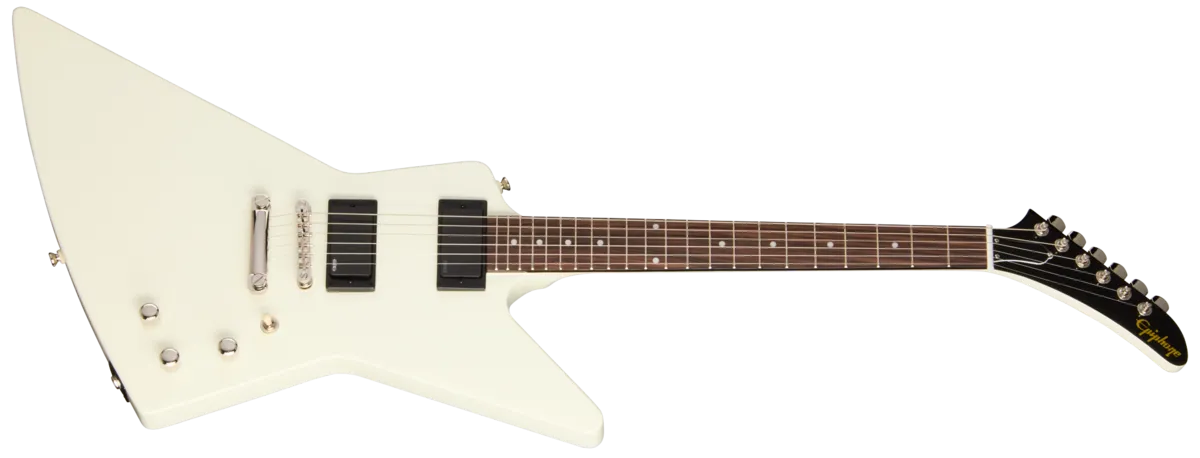 The Explorer 80s EMG features a fast-playing mahogany neck with a 60s SlimTaper ™ profile. The neck is topped with a rosewood fretboard that features 22 medium jumbo frets and simple pearloid dot inlays. The Explorer headstock is equipped with mini die-cast tuners and a Graph Tech® nut to ensure solid tuning stability. The other ends of the strings pass over an Epiphone LockTone ™ Tune-O-Matic™ bridge and are anchored with a LockTone Stop Bar tailpiece. The iconically shaped mahogany body is outfitted with active EMG ™ pickups, with an EMG 60 in the neck position and an EMG 81 in the bridge position. They accurately capture the unique, fat-toned sound and rich sustain of the Explorer models that many players preferred during that era. A 9V battery powers the active EMG pickups, and the battery compartment is located on the back of the guitar for quick and easy access. The pickups are wired to individual volume controls and a master tone control; the controls are capped with knurled metal control knobs. There is no pickguard, which helps to give the Explorer 80s EMG a sleek and slightly menacing appearance. If you're into retro-futuristic guitars, the Explorer 80s EMG is a stunning tribute to that era's edge and attitude. It comes packed in a premium gig bag and is ready to partner with you to rock the world.