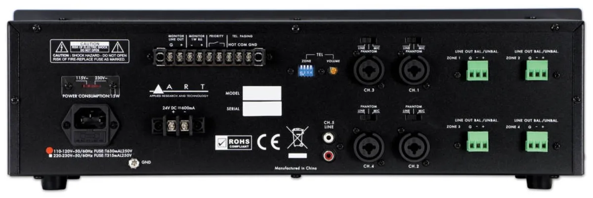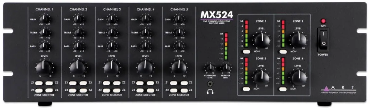 With five input channels and four output zones, the MX524 is our most fully-featured zone mixer.Four channels feature combo inputs for XLR or 1/4" connections, and switchable phantom power for condenser microphones. The fifth channel offers RCA line inputs.All channels have controls for input gain and output level as well as two-band EQ, and can be assigned to any or all of the zones. Each zone has an independent level control, and any combination of zones can be monitored by headphones or the line out terminals.When a signal is detected on the first input, the other channels will automatically lower in volume so that announcements can be clearly heard throughout a venue. Rear terminal connections also allow the connection of an auxiliary telephone signal for paging.Flexible and easy to use, the MX524 is an ideal solution for distributed audio in restaurants, conference rooms, houses of worship, and more.