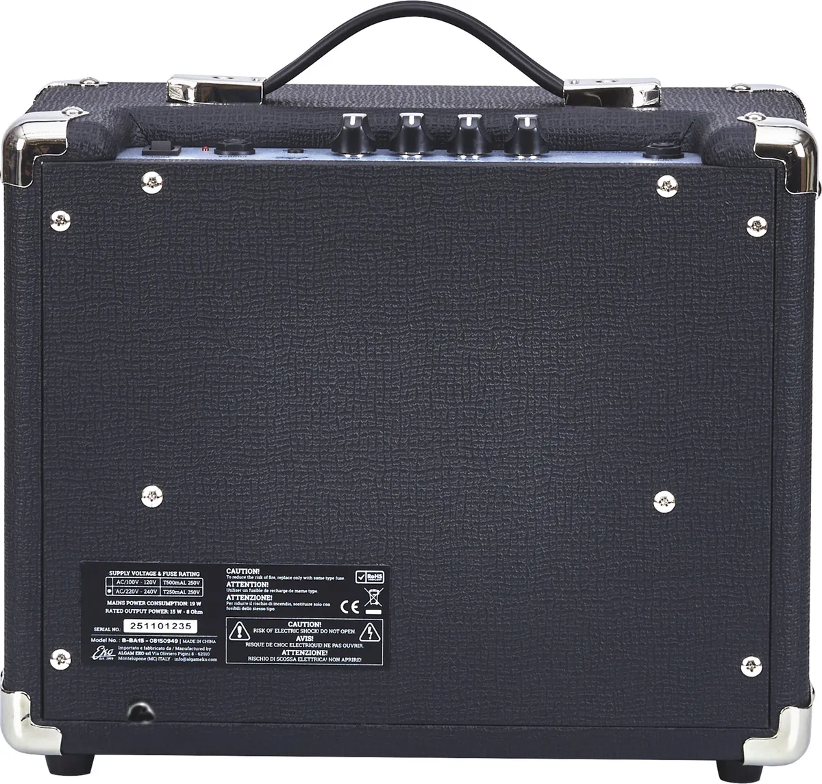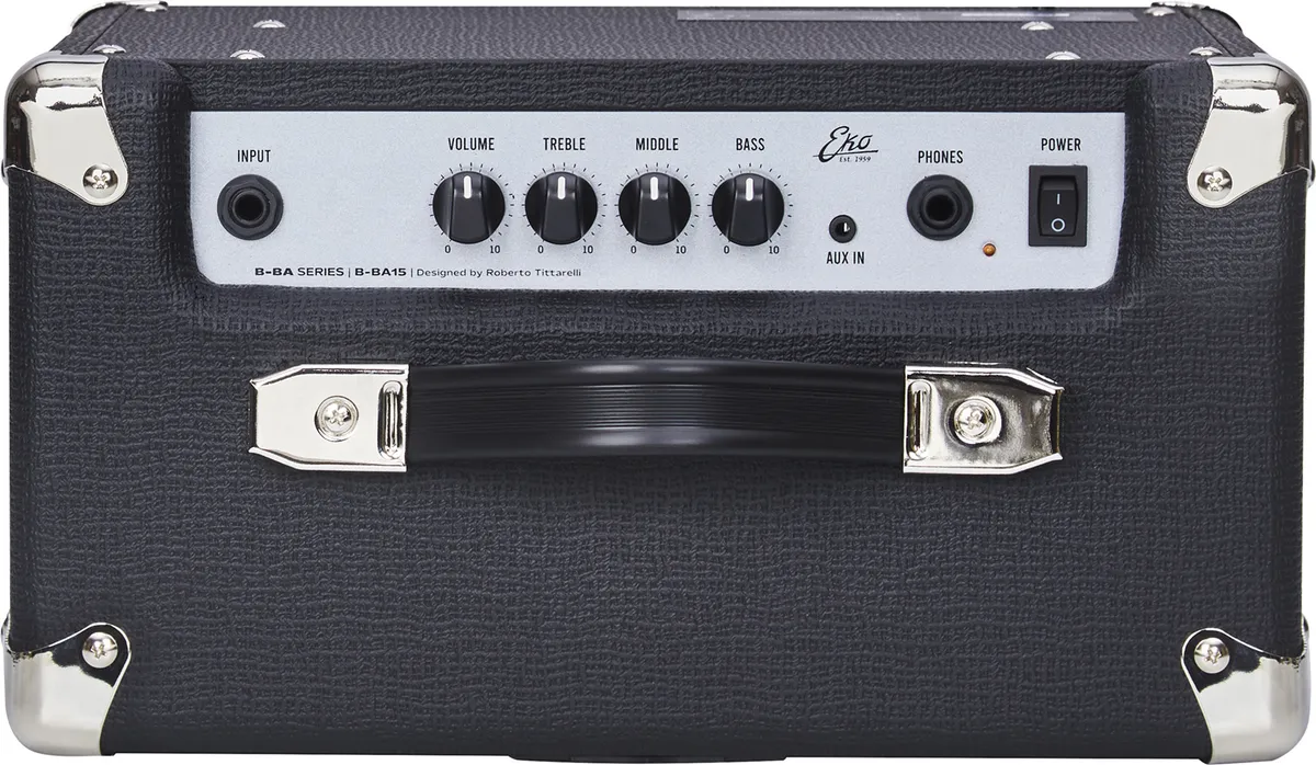 An ideal combo for playing your first notes!This small 15W transistor combo, developed by Italian brand Eko in partnership with technician Roberto Tittarelli, is the ideal companion for any bassist looking for a small, effective amplifier for practicing at home without upsetting their partner or neighbors. Its very light weight, around 5 kg, makes it a highly portable amp, perfect for small rehearsals and playing your first notes.A simple interface!Don't let the size of this little combo fool you into underestimating its capabilities! It features a volume control and 3-band EQ for precise adjustment of the final sound. In addition to its jack input for the bass, it has a minijack auxiliary input so you can play your favorite songs and practice along with them. Finally, this amp includes a headphone output so you can practice discreetly if needed.Compact and lightweight, the B-BA15 is the ideal bass combo for any bassist looking for an amp to practice at home or for small rehearsals, offering exceptional value for money.