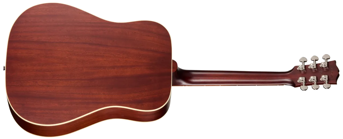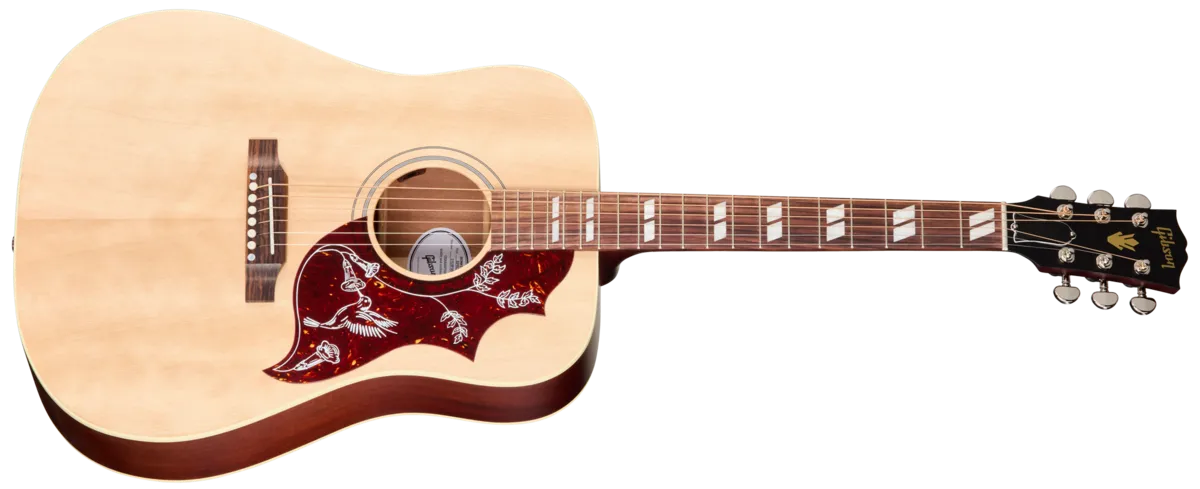 First introduced in 1960, the Gibson Hummingbird™ is one of the most distinctive and well-loved acoustic guitars ever made. Handcrafted with care in Bozeman, Montana, by Gibson's expert acoustic luthiers, the new Gibson Hummingbird Special offers players a USA-built Gibson Hummingbird model at a very attractive price. The Hummingbird Special has a traditional square-shouldered body constructed using genuine solid mahogany for the back and sides and a solid Sitka spruce top that is reinforced with our traditional scalloped X-bracing. This combination of tonewoods delivers a warm, balanced tone with excellent dynamic range that is perfect for any style of music. The "concert depth" body is slightly thinner than the body on a Hummingbird Standard, giving it a leaner and tighter bass response that sits perfectly in the mix and also makes it easier to hold. The utile neck is attached to the body with a compound dovetail neck-to-body joint, and like all Gibson acoustic guitars, it is affixed with hot hide glue. The neck has a comfortable Round profile, and the rosewood fretboard has a 12" radius and features pearloid parallelogram inlays, which is one of the visual hallmarks that makes the Hummingbird easily recognizable. The fretboard is fitted with 20 standard frets. The traditional belly-up rosewood bridge is equipped with a TUSQ® saddle, and the nut and bridge pins are also TUSQ. High-quality Grover® Rotomatic® tuners ensure rock-solid tuning stability. The pickguard features a simplified version of the world-famous Hummingbird pickguard graphics. The Hummingbird Special is finished in satin nitrocellulose lacquer in your choice of Satin Ebony, Satin Natural or Satin Honey Burst. It comes equipped with an L.R. Baggs™ Element Bronze under-saddle piezo pickup and active preamp with an easily accessible soundhole-mounted volume control, so it's stage and studio-ready from the moment you take it out of the included premium soft shell case.