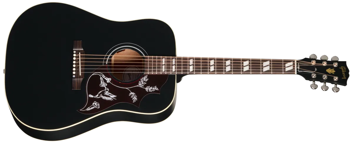 First introduced in 1960, the Gibson Hummingbird™ is one of the most distinctive and well-loved acoustic guitars ever made. Handcrafted with care in Bozeman, Montana, by Gibson's expert acoustic luthiers, the new Gibson Hummingbird Special offers players a USA-built Gibson Hummingbird model at a very attractive price. The Hummingbird Special has a traditional square-shouldered body constructed using genuine solid mahogany for the back and sides and a solid Sitka spruce top that is reinforced with our traditional scalloped X-bracing. This combination of tonewoods delivers a warm, balanced tone with excellent dynamic range that is perfect for any style of music. The "concert depth" body is slightly thinner than the body on a Hummingbird Standard, giving it a leaner and tighter bass response that sits perfectly in the mix and also makes it easier to hold. The utile neck is attached to the body with a compound dovetail neck-to-body joint, and like all Gibson acoustic guitars, it is affixed with hot hide glue. The neck has a comfortable Round profile, and the rosewood fretboard has a 12" radius and features pearloid parallelogram inlays, which is one of the visual hallmarks that makes the Hummingbird easily recognizable. The fretboard is fitted with 20 standard frets. The traditional belly-up rosewood bridge is equipped with a TUSQ® saddle, and the nut and bridge pins are also TUSQ. High-quality Grover® Rotomatic® tuners ensure rock-solid tuning stability. The pickguard features a simplified version of the world-famous Hummingbird pickguard graphics. The Hummingbird Special is finished in satin nitrocellulose lacquer in your choice of Satin Ebony, Satin Natural or Satin Honey Burst. It comes equipped with an L.R. Baggs ™ Element Bronze under-saddle piezo pickup and active preamp with an easily accessible soundhole-mounted volume control, so it's stage and studio-ready from the moment you take it out of the included premium soft shell case.