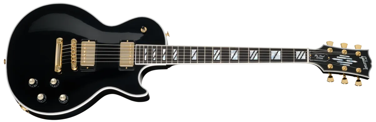The return of the Les Paul™ Supreme has been enthusiastically welcomed by players around the globe. With its updated specifications and striking design, it quickly stood out as one of the most compelling guitar launches of the past year. Responding to continued player interest, Gibson now presents a new two-pickup configuration finished in a timeless opaque Ebony. Few instruments are as instantly recognizable as the Gibson Les Paul, a model revered by generations of musicians and heard across virtually every style of music. With the Les Paul Supreme, Gibson delivers a true flagship guitar-one that blends contemporary performance, refined craftsmanship, and bold visual appeal.This Les Paul Supreme is built with a plain maple top paired to a mahogany body, delivering both classic tone and modern refinement. A pickguard-free design enhances its clean, streamlined aesthetic. The mahogany neck is carved to a fast and comfortable Slim Taper T™ profile and features a Modern Contoured Heel, allowing seamless access to the upper frets. An ebony fretboard with a 10"-16" compound radius supports fluid bends and comfortable chord work alike, while 22 medium jumbo frets and elegant Super Split Block mother-of-pearl inlays complete the playing surface. Crowning the instrument is a newly introduced mother-of-pearl "Chandelier Inlay" on the headstock, inspired by a 1940s-era design uncovered in the Gibson archives. Locking Grover® tuners with Keystone buttons, a Graph Tech® nut, an aluminum Nashville Tune-O-Matic ™ bridge, and an aluminum Stop Bar tailpiece work together to provide stable tuning, accurate intonation, and impressive sustain.At the heart of the Les Paul Supreme's sound are Burstbucker ™ Pro Rhythm and Burstbucker Pro + Lead pickups. These are combined with push/pull volume controls for coil tapping, along with push/pull tone controls that engage phase switching and Pure Bypass for expanded tonal versatility. Finished in classic Ebony and accented with gold hardware, the Les Paul Supreme delivers commanding sound, extensive sonic flexibility, and unmistakable visual presence. For players seeking a no-compromise instrument that excels in tone, feel, and appearance, the Les Paul Supreme represents the highest level of modern Gibson design and craftsmanship. A hardshell case is included to ensure secure storage and reliable transport.