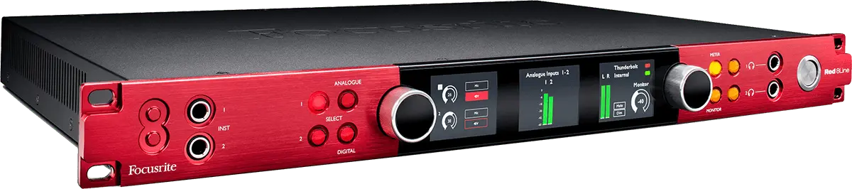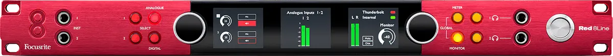 Other features of the Red 8Line include precision metering and display: the interface has three LCD displays for highly-accurate level metering for any input or output block, as well as main monitor and headphone outputs. Two discrete high-fidelity headphone outputs are powerful enough to deliver loud and clear audio on high-impedance headphones, and are controlled from the interface front panel. Dual instrument inputs on the front panel ensure you always have immediate access to quickly plug in a guitar, for example, even when racked.