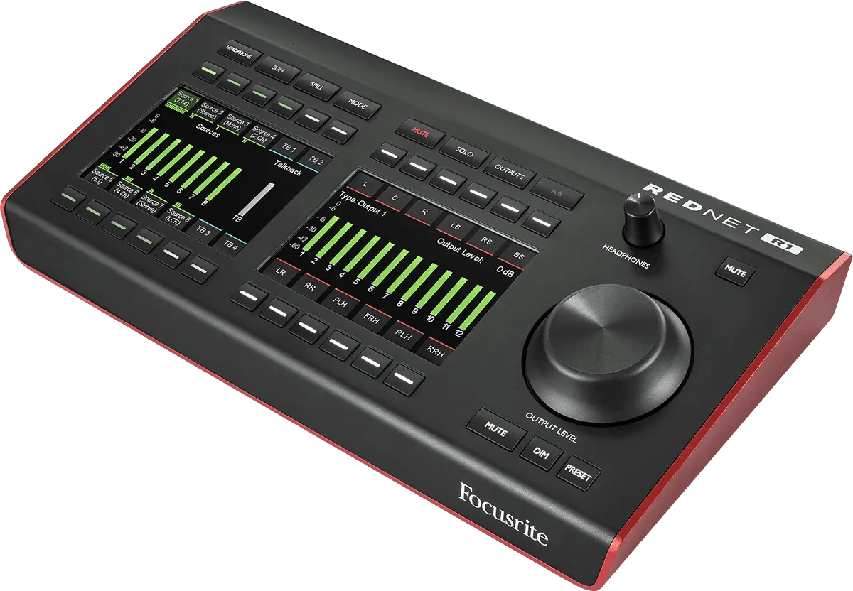 RedNet R1 is a desktop remote controller that supercharges any Red range interface, by enabling audio professionals to interact with their audio like never before. It can control a range of different monitor output setups, ranging from mono through to 7.1.4 surround, including Dolby Atmos® and other immersive audio workflows. Alternatively, completely custom setups of up to 12 outputs can be configured for bespoke speaker configurations.