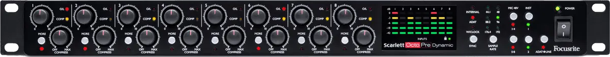 The Focusrite Scarlett OctoPre Dynamic expands your setup with eight additional 2nd-generation Scarlett mic preamps, and per-channel analog compression for control over your dynamics. Also onboard is Focusrite's high-res 24-bit/192kHz AD/DA conversion. OctoPre Dynamic gives you eight line outputs to feed your analog rig, along with ADAT optical I/O to expand any ADAT-equipped interface. OctoPre Dynamic's pristine Focusrite preamps, high-quality conversion, and expansion capabilities make it the ideal way to grow your studio.