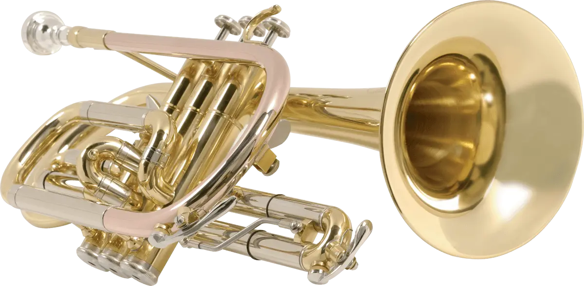 Rose brass leadpipe, medium large bore. Thin bell 125mm diameter, enriched with copper for a soft sound. Beautiful engraving. Metal piston buttons, heavy bottom caps. Triggers on 1st and 2nd valve slides. Deluxe soft case backpack.