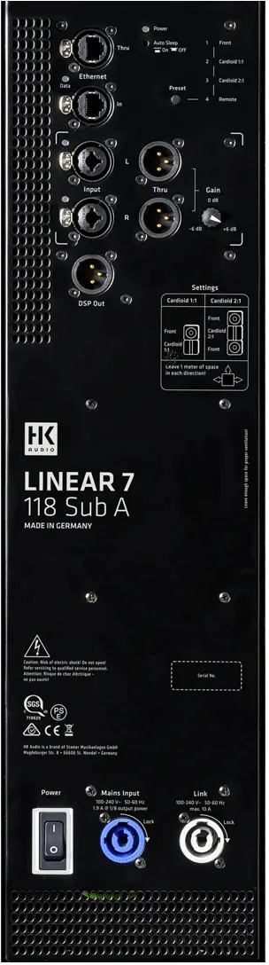Additional DSP-Out that lets you integrate an added non-network-compatible powered cabinet (such as your LINEAR series active subwoofers) into the network and remotely control it with all the parameters of the LINEAR 7 DSP that´s easy to control with the direct access to easy selectable presets for use as full range cabinet or in a system, even in a non-network setup. The futureproof Audio-Streaming (Certification for MILAN is in the works) operates in high resolution 96 kHz AD/DA converters, FIR-filtering and low latency.