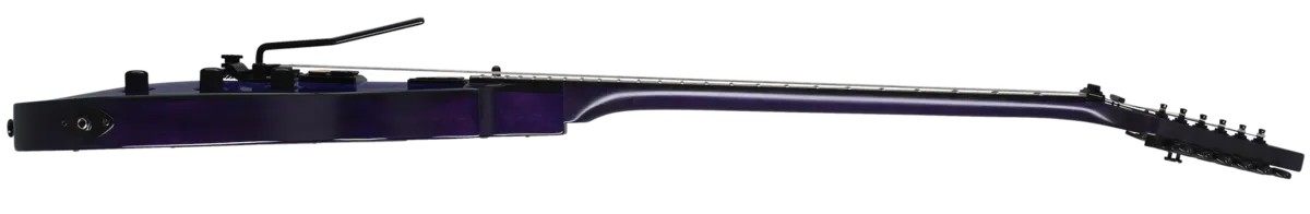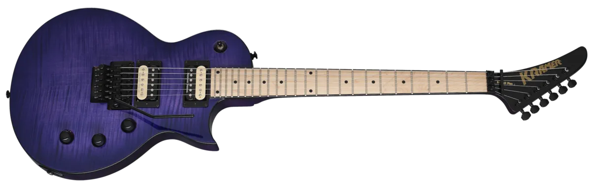 The Assault Plus is part of the new Kramer Modern Collection and combines a classic Les Paul®-style body with the speed, power, and reliability of Kramer. Featuring a mahogany body with a flame maple veneer top, reverse headstock, Seymour Duncan® JB™ and JN “zebra coil” humbuckers wired to individual series/parallel push-pull volume potentiometers, and a Floyd Rose® 1000 series tremolo with R2 1000 series locking nut. Available in Bengal Burst and Trans Purple Burst.