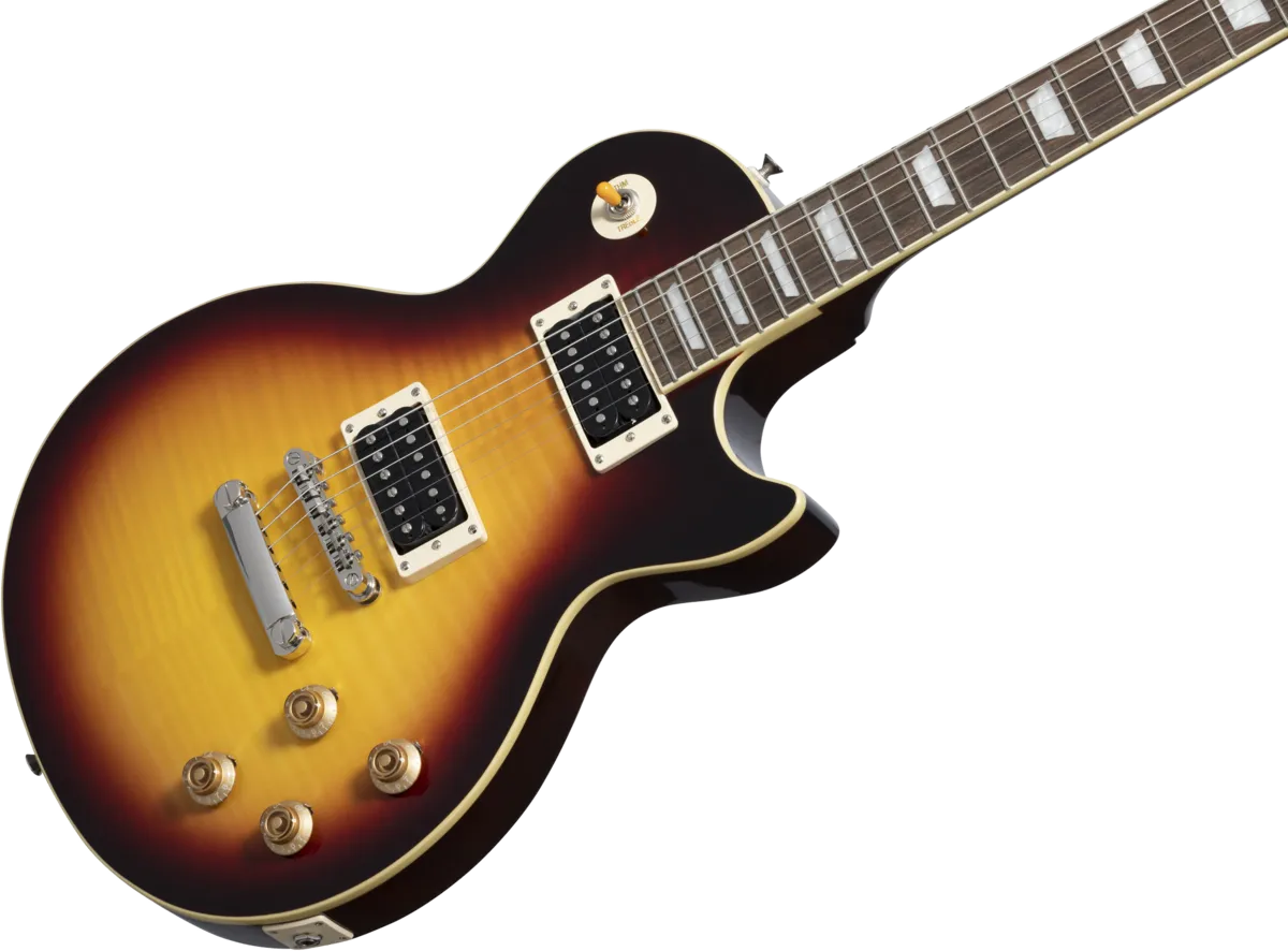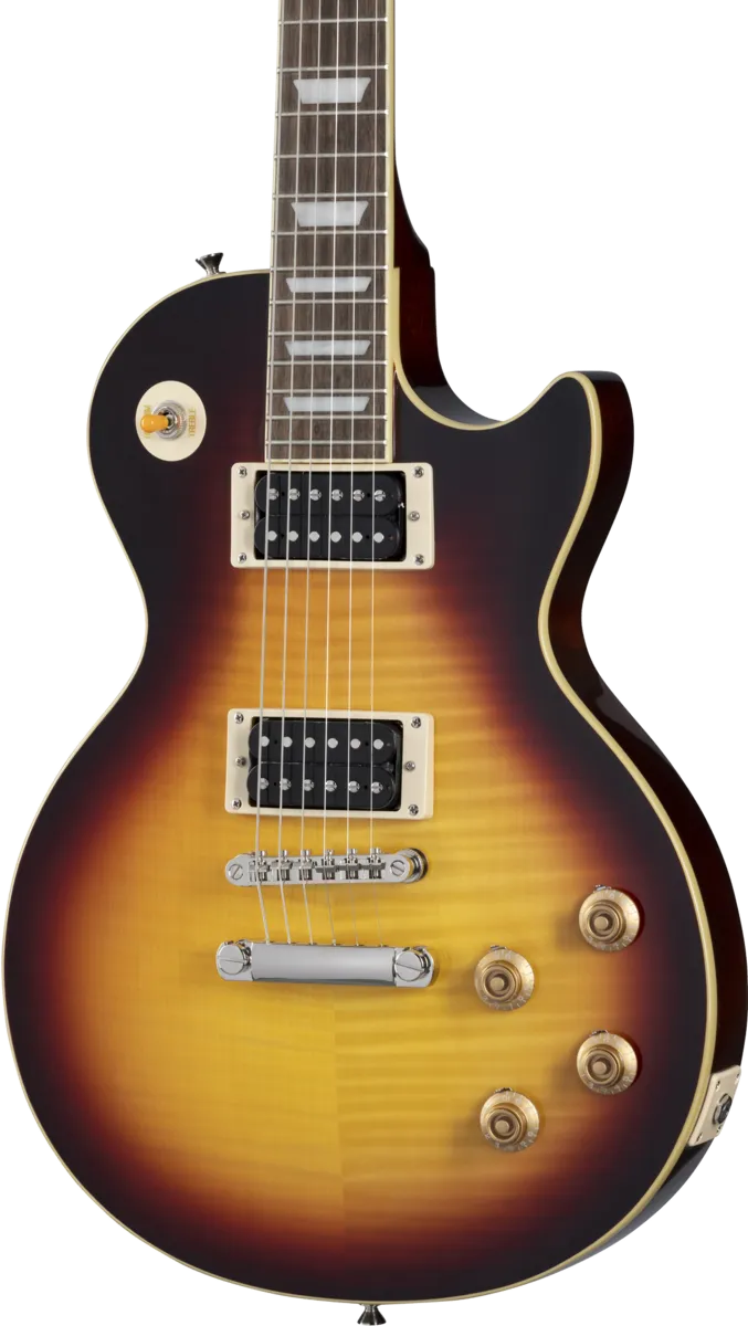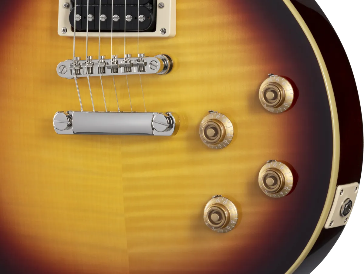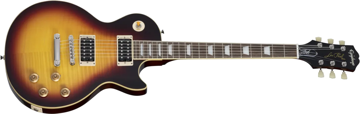 Epiphone and Slash are proud to present the Slash Collection. Part of the Inspired by Gibson Collection, it celebrates influential guitars Slash has used during his career, inspiring multiple generations of players around the world. Perfect for every stage and players of all levels, the Epiphone Slash Les Paul Standard features a mahogany body, maple cap with AAA flame maple veneer, a Graph Tech nut, Epiphone LockTone Tune-O-Matic bridge and Stop Bar tailpiece, and Slash’s personal touches including a C-shape neck profile, Epiphone Custom ProBucker pickups, color-coordinated hardware appointments, CTS potentiometers with Orange Drop capacitors, Epiphone Strap Locks, and a custom hardshell case. Exclusive to the Slash Collection are Slash’s “Skully” signature drawing on the back of the headstock and Slash’s signature on the truss rod cover.