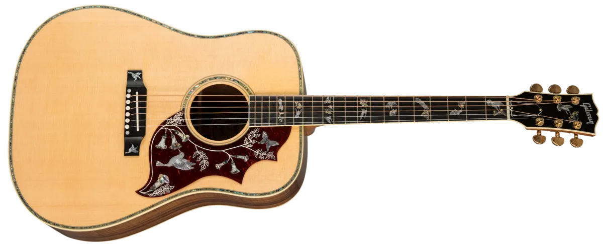 This rare Custom Shop Hummingbird™ model features hand inlaid and hand-engraved hummingbirds on the headstock, fingerboard, pickguard, and bridge. This hand-built instrument is a true custom piece! The tonewood combination of spruce and koa allows for a bright, but balanced sound, true to the Hummingbird’s reputation as a player’s dream.