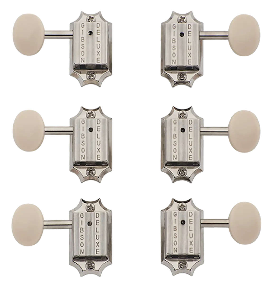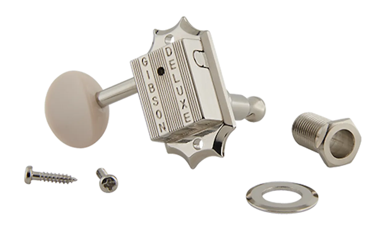 Gibson’s vintage machine heads feature closed housing construction with period-correct vintage styling and traditional White Button keys. This set delivers precise tuning while adding a luxurious, classic feel to your guitar’s headstock. This factory-spec set comes in a Vintage Nickel finish. Special note: these tuners feature screw in bushings, which require a larger diameter mounting hole than traditional ‘push in’ bushing tuners. 14:1 Tuning Ratio