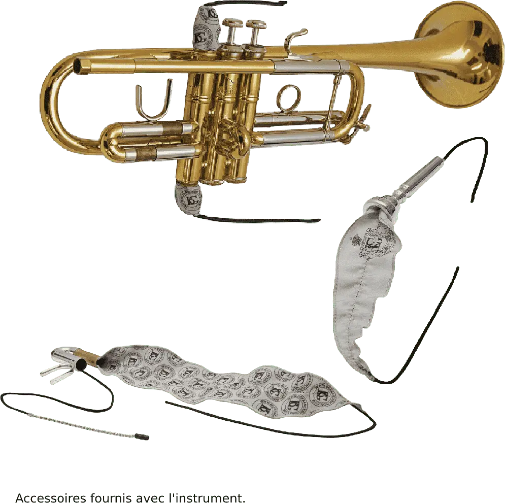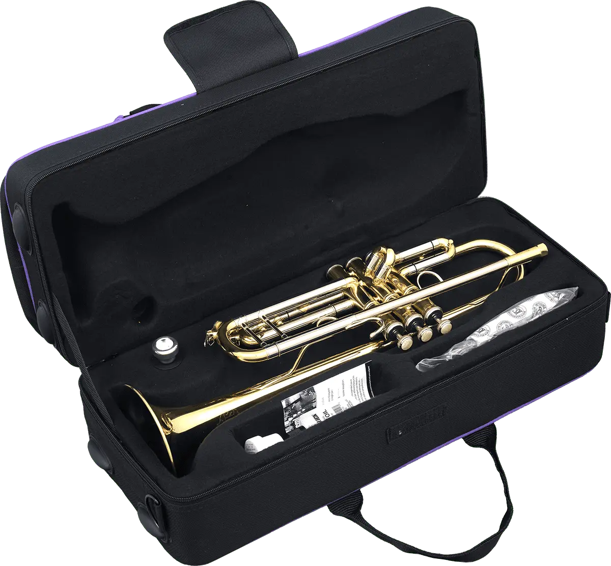 11,66 mm bore, 125mm yellow brass bell. Monel pistons, gold brass leadpipe. This trumpet is in pure American style; dual-brace to the main tuning slide, nickel silver outer slides, comfortable ring and long screw stop on 3rd valve slide, saddle on 1st valve slide, waterkey on 3rd valve slide and on main tuning slide, hexagonal mouthpiece receiver. Soft case backpack and maintenance kit.