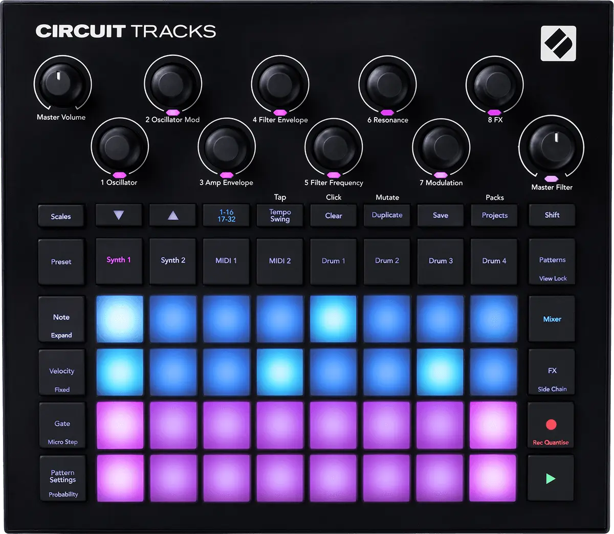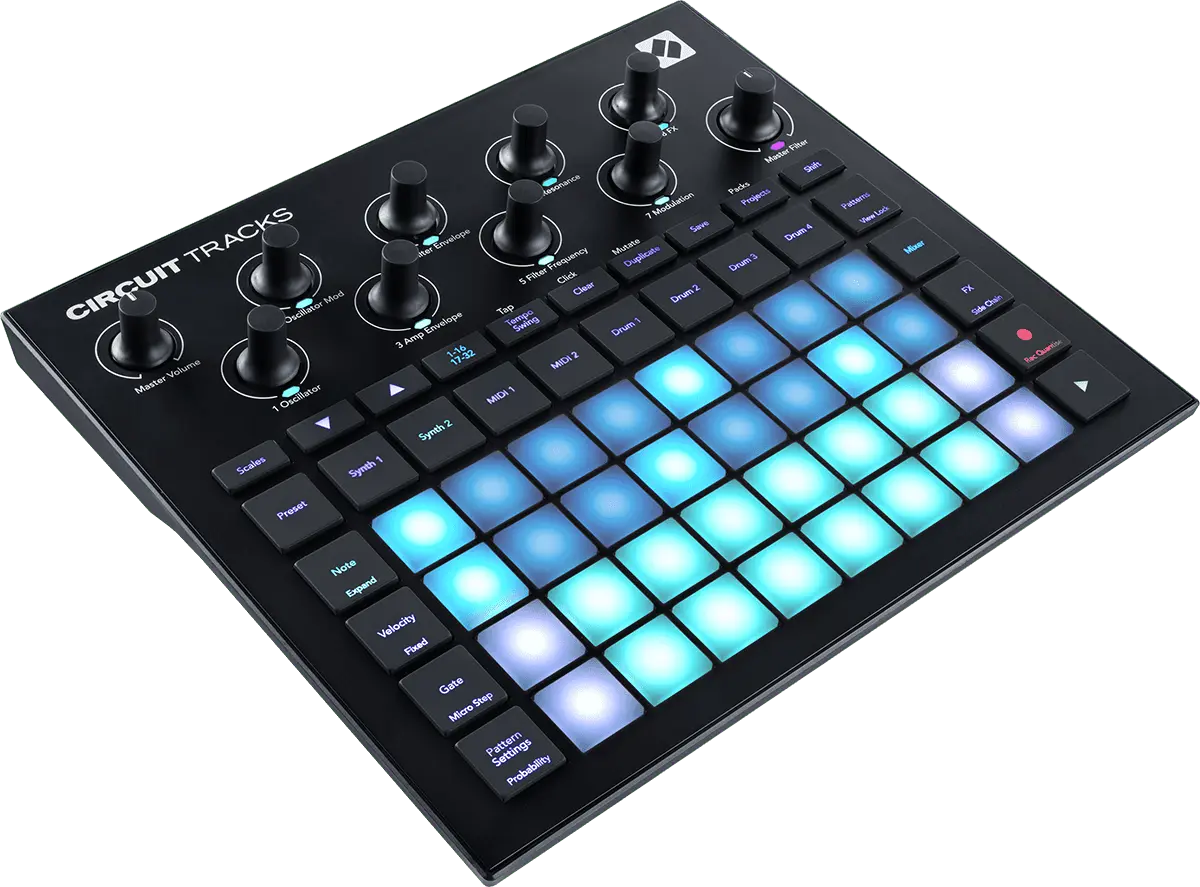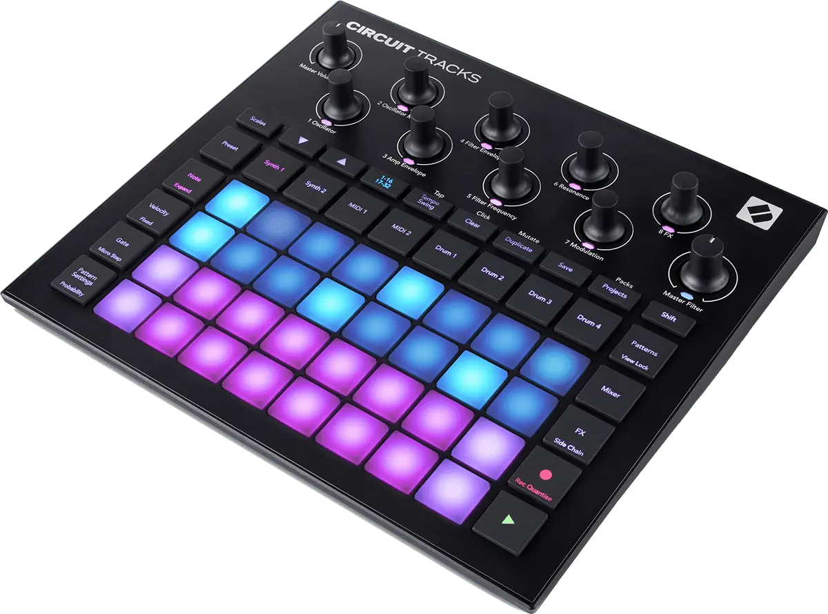 Engineered for immediacy and pure creative expression, Circuit Tracks is a performer’s dream. Velocity-sensitive pads and tactile control with customisable patches bring you closer to your music for maximum enjoyment. Define your sound by going off-grid with microtiming, and keep evolving with probability and pattern mutate.