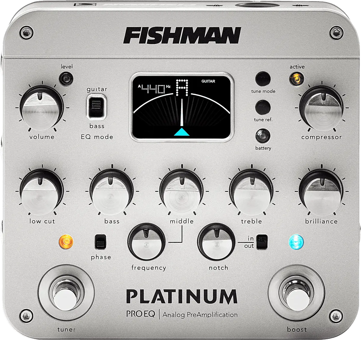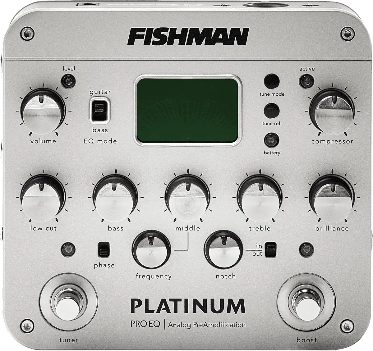 Completely redesigned from the ground up, the all-analog Platinum Pro EQ universal instrument preamp delivers incredibly accurate sonic detail for any acoustic instrument. A discrete, high-headroom Class-A preamp uses precision, high-speed circuitry for the highest fidelity and low distortion. Classic Fishman tone centers with sweepable mid is combined with a switchable guitar/bass EQ mode, making it more musical for bass instruments and more universal for recording and performing musicians.