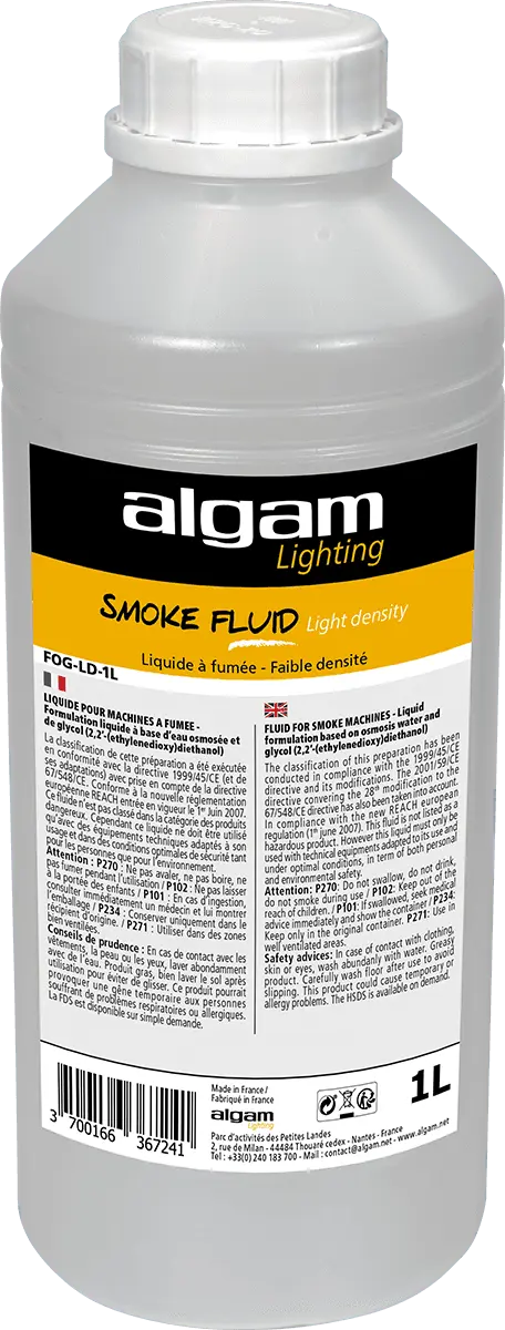 Fluid for low-density smoke, which will dissipate fairly quickly. Ideal for small volumes or to create a slightly foggy atmosphere, while enhancing light shows. Algam Lighting fluids are manufactured in France according to an extremely strict process, in compliance with all the legal standards for these products. Reliable and efficient, Algam Lighting fluids are compatible with most machines on the market.