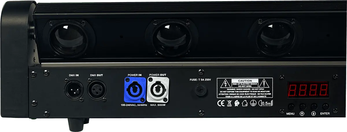The MB810 bar suits all your requirements thanks to its different operating modes: Automatic and Musical for a stand-alone show, Master/Slave and DMX for advanced configurations. In Automatic mode, the bar runs impressive sequences of pre-programmed internal programs, from sweep to chaser to strobe. In Musical mode, movements and color changes harmonize with the beat of the music, creating a festive, lively ambience.