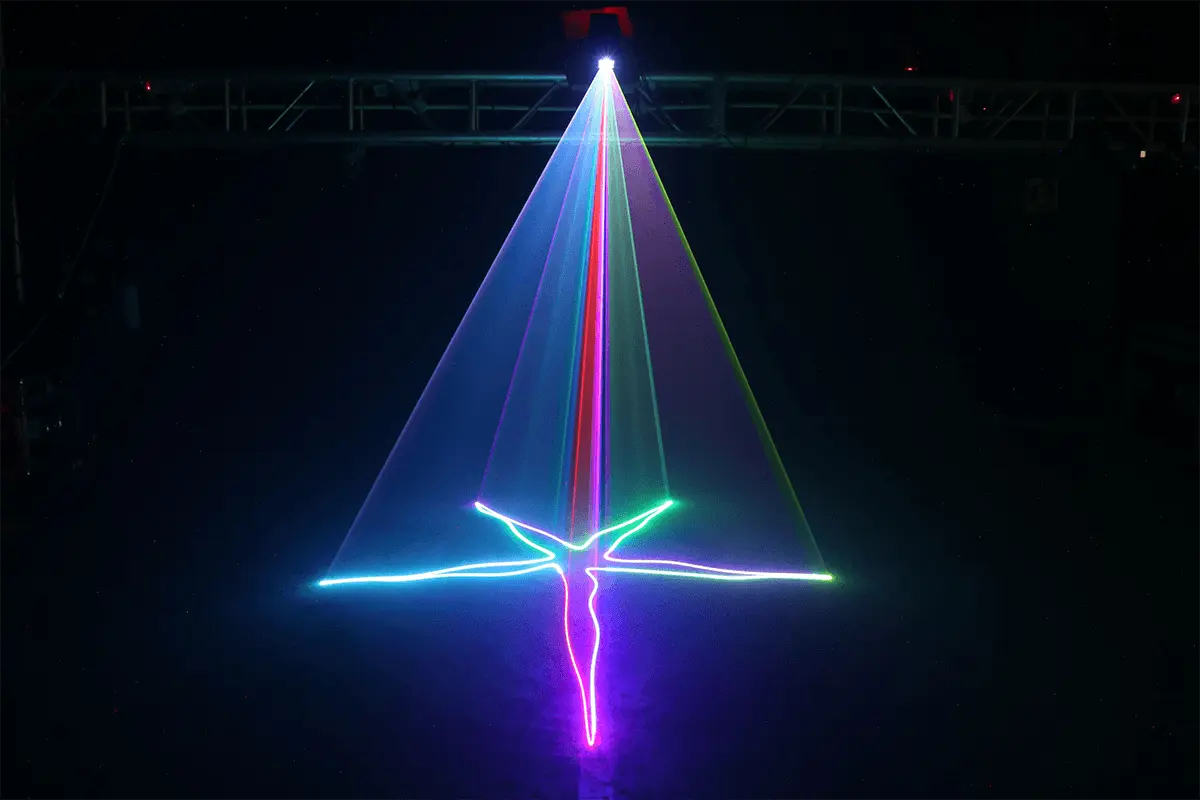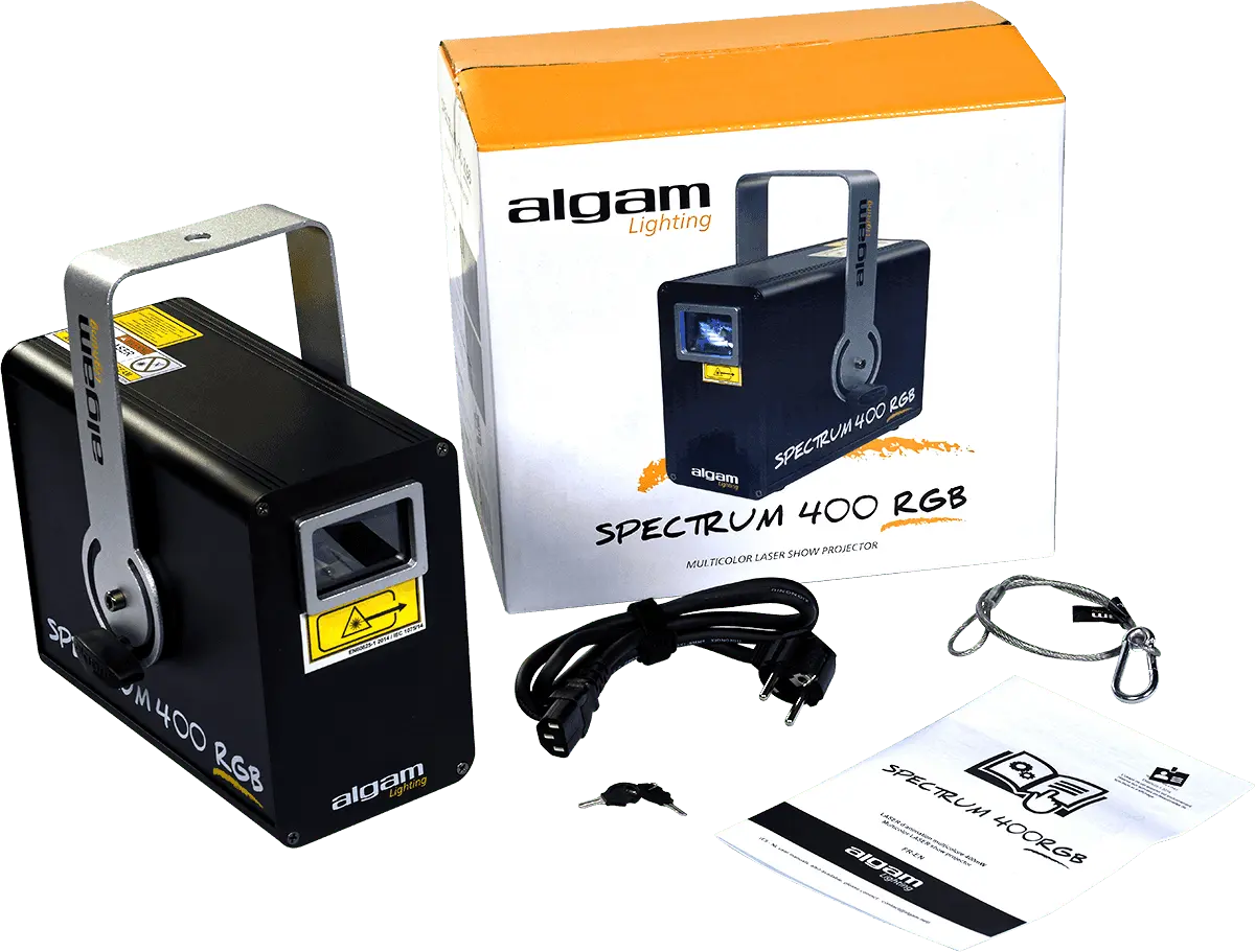 The Spectrum 400 RGB proudly features a total power of 400mW distributed over 3 motorised lasers ensuring surprisingly effective effects for this category. Ideal for DJs or mobile discos, the Spectrum 400 RGB, thanks to its 3 laser light sources (1 red, 1 green and 1 blue), allows multiple effects to animate the dance floor during weddings, private parties… Easy to use, offering no less than 128 internal programmes (tunnel effects, waves, geometric patterns, graphics, etc.) for automatic or music-controlled operation, the Spectrum 400 RGB is fully DMX controllable on 11 channels for precise control of the laser effects and their rotation speed, and for remote supervision of the many options available to create a multitude of stunning effects.