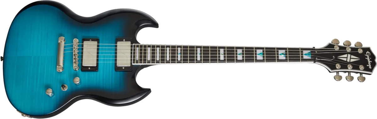 The Epiphone Prophecy SG brings high-performance features to the classic SG™ design, making it an excellent choice for today's progressive guitarists. The mahogany body is topped with a 1/2" maple cap and beautiful AAA flame maple veneer, along with a thinner Aged Vintage Gloss finish. The SlimTaper™ asymmetrical mahogany neck features a 24 fret ebony fingerboard with jumbo frets, Block and Triangle pearloid/abalone inlays with abalone selected to complement the body color, brushed nickel Grover® Locking Rotomatic® tuners, and a black Graph Tech® NuBone® nut. The Epiphone Prophecy SG comes with brushed nickel hardware and is equipped with a pair of proprietary Fishman Fluence® pickups with three voicing options that are selected with the push/pull master volume and tone controls - high gain, modern active high-output humbucker™ with both controls pushed in, classic Patent Applied For-style humbucker when the tone control is pulled out, and shimmering, optimized single-coil tones when the volume control is pulled out.