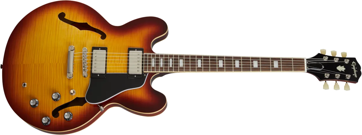 The Epiphone "Inspired by Gibson" ES-335 Figured honors the immortal ES-335, the thin semi-hollow archtop that brought archtop class to the rock era. Featuring a solid maple center block for added sustain and feedback resistance, Alnico Classic PRO™ humbuckers, Grover® Rotomatic® tuners, and a flame maple veneer top and back in stunning Blueberry Burst and Raspberry Tea Burst gloss finishes that are sure to turn heads.
