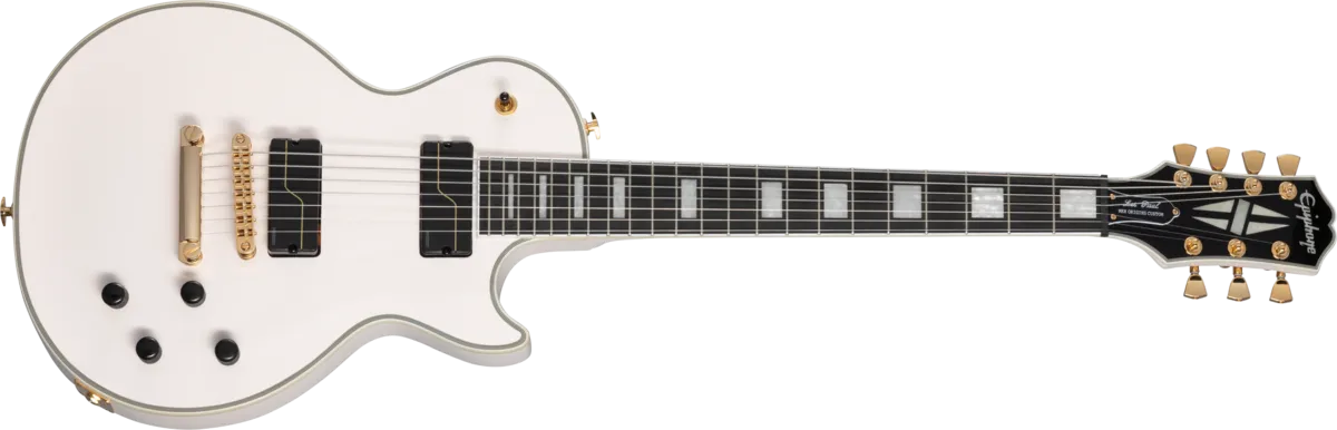 Epiphone is proud to introduce the Matt Heafy Les Paul™ Custom Origins 7-String, our newest signature model designed in partnership with Trivium’s extraordinarily talented Matt Heafy. It features a pair of custom-voiced Fishman Fluence® pickups, each of which delivers three distinct tones. The Alnico neck pickup provides a modern, active, high-output Alnico humbucker™ sound; a crisp, clean, and fluid neck humbucker sound; and a glassy, scooped, hi-fi single-coil sound. The ceramic bridge pickup offers a choice of modern, active, high-output ceramic-humbucker tone; high-output, passive ceramic-humbucker tone; and a cutting, overwound single-coil tone. Push-pull volume and tone pots put all these incredible sounds right at your fingertips and make it easy to explore the expansive sonic palette this guitar offers. The maple-capped mahogany body has modern weight relief for hours of comfortable play, and the mahogany neck has a fast-playing SpeedTaper™ D profile and a contoured heel for exceptional upper-fret access. Gold hardware, including locking Grover® Mini Rotomatic® tuners with Tulip buttons, and classic Les Paul Custom cosmetics make this a standout guitar on stage. Available in Ebony and Bone White gloss finishes in both right- and left-handed configurations. A custom hardshell case is included.