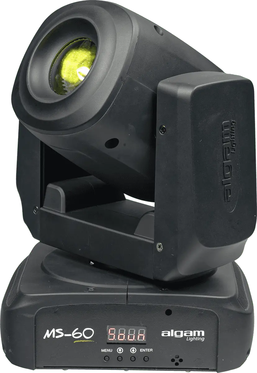 The MS60 spot moving head has a remarkably compact design and projects a powerful beam thanks to its 60W white LED. Its 8-gobo wheel coupled with an 8-colour wheel, its motorised focus and triple prism guarantee multiple and powerful light effects. With a quiet, professional-grade motor, this projector quickly and accurately pans up to 540° and tilts up to 270°. The moving head can be remotely controlled via its DMX input/output and set to automatic or music-controlled mode with its built-in control panel.