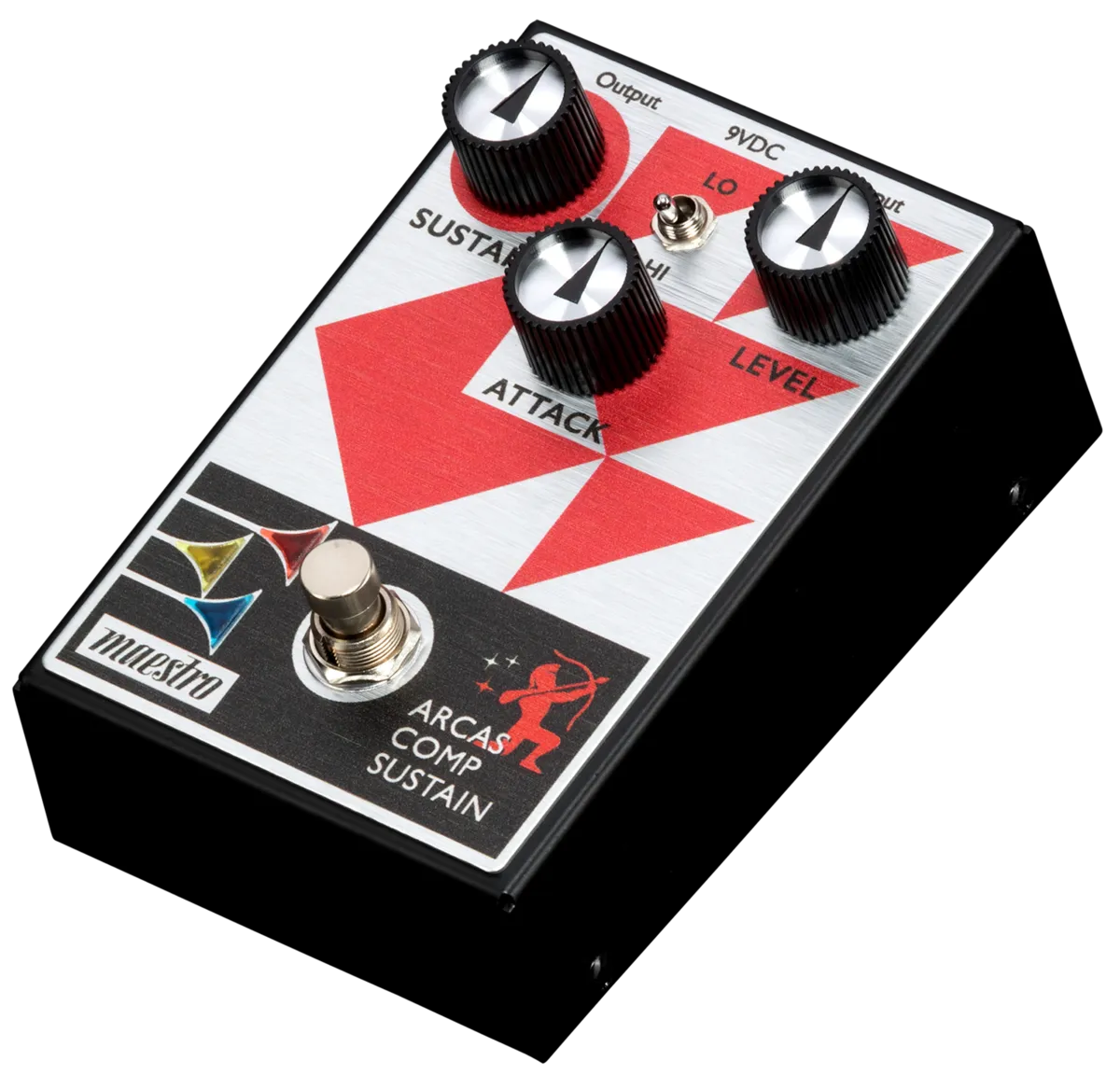 The Maestro Arcas Compressor Sustainer pedal provides excellent versatility. It offers both transparent, light compression as well as heavy, tight compression. It delivers enough sustain and level compensation to become a go-to workhorse for any situation. This all-analog pedal boasts a two-position Mode toggle switch for increased sonic versatility. The LO mode is less sensitive to pick attack, while the HI mode is more sensitive to pick attack. The intuitive 3-knob control layout lets users quickly dial up the desired Sustain (amount of gain applied during compression), control the Attack (how fast the compression engages), and adjust the amount of gain compensation and the pedal’s overall output volume with the Level control. The true bypass footswitch triggers the LED lights in the bugles in the Maestro logo when it’s on, so you’ll always know when the effect is active.