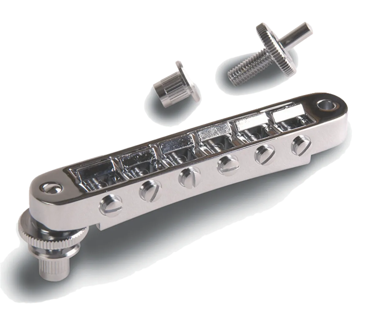The Gibson Tune-o-matic bridge remains one of the most revered and copied pieces of guitar hardware ever developed, and the Nashville Tune-o-matic bridge offers un-notched saddles with individual saddle screw retainer clips, and a wider footing for increased intonation range. The stud and thumbwheel are also cast directly onto the bridge, allowing the Nashville Tune-o-matic to slide directly into place.