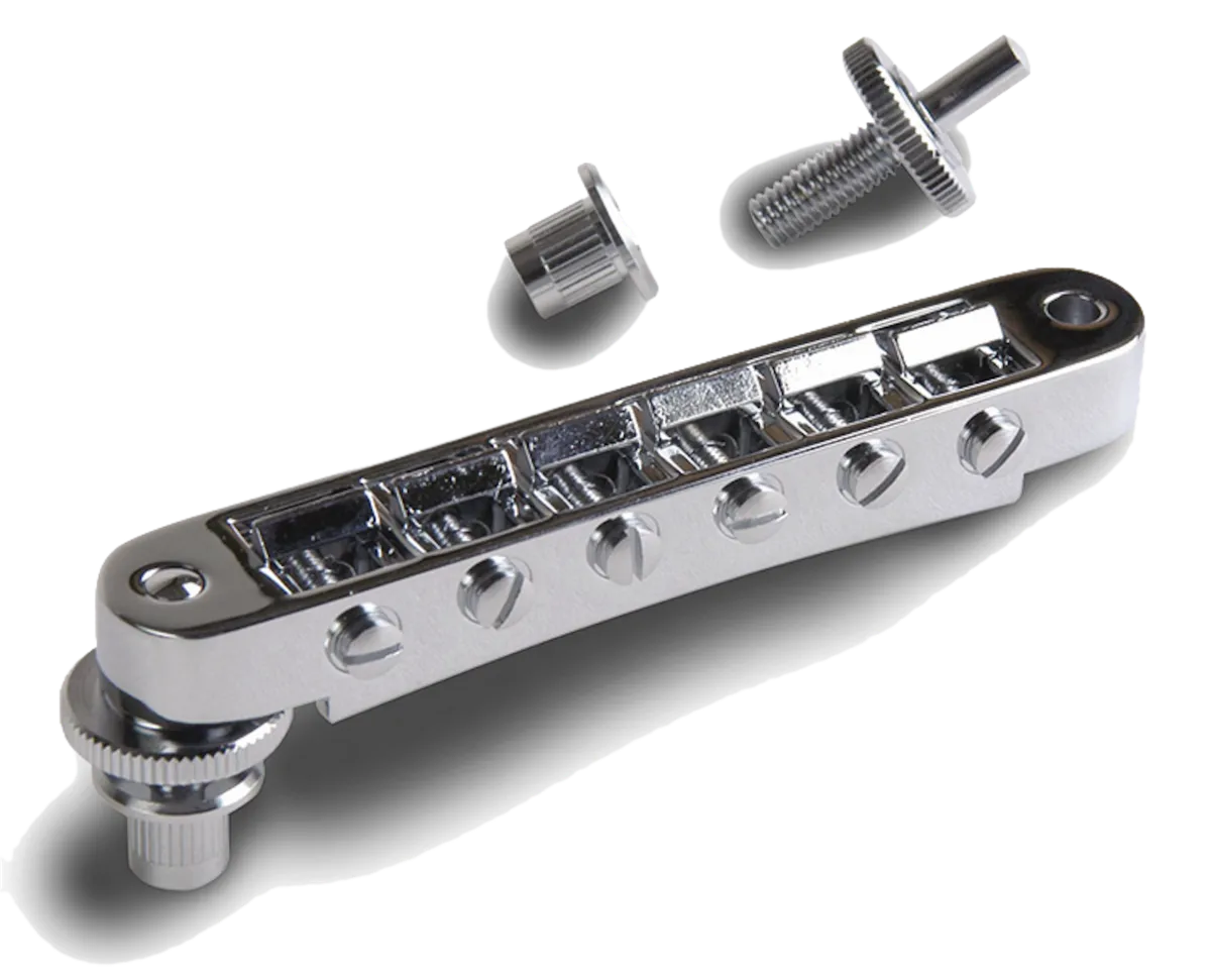 The Gibson Tune-o-matic bridge remains one of the most revered and copied pieces of guitar hardware ever developed, and the Nashville Tune-o-matic bridge offers un-notched saddles with individual saddle screw retainer clips, and a wider footing for increased intonation range. The stud and thumbwheel are also cast directly onto the bridge, allowing the Nashville Tune-o-matic to slide directly into place.