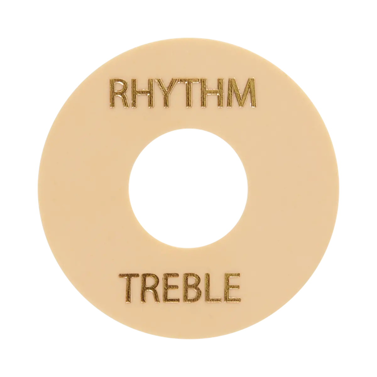An exact replacement for worn out toggle switch washers, securely fitting over the switch shaft and held in place by the nut. This OEM part is made from ABS plastic and available in either black or crème, both with the gold imprinted letters "RHYTHM" and "TREBLE".