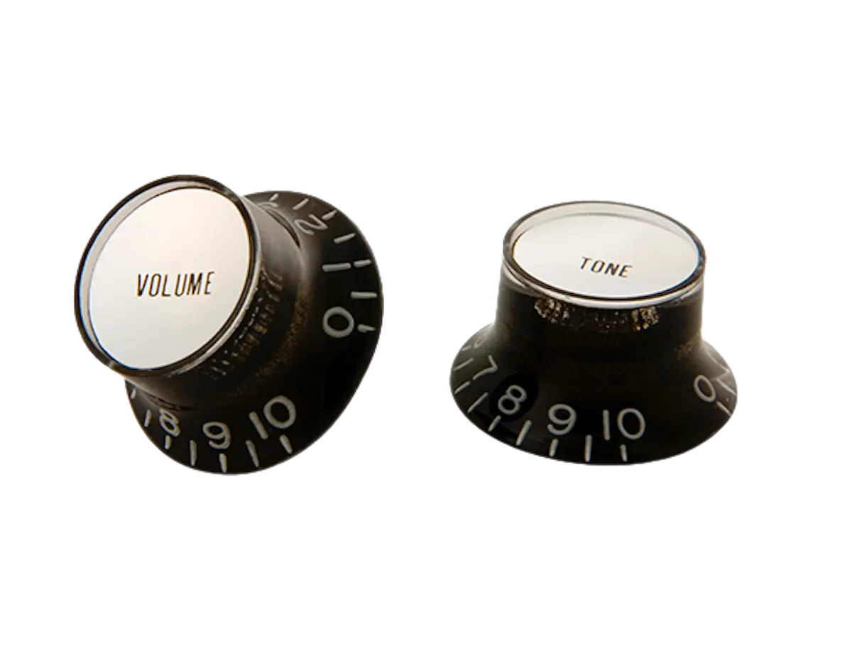 These genuine Gibson OEM top hat style knobs are the same knobs found on many Gibson SG models, but can also be used for any vintage restoration project, changing your guitar's look, or for the replacement of lost knobs. These black Gibson top hat style knobs with silver metal inserts come packaged in sets of four: two volume and two tone.