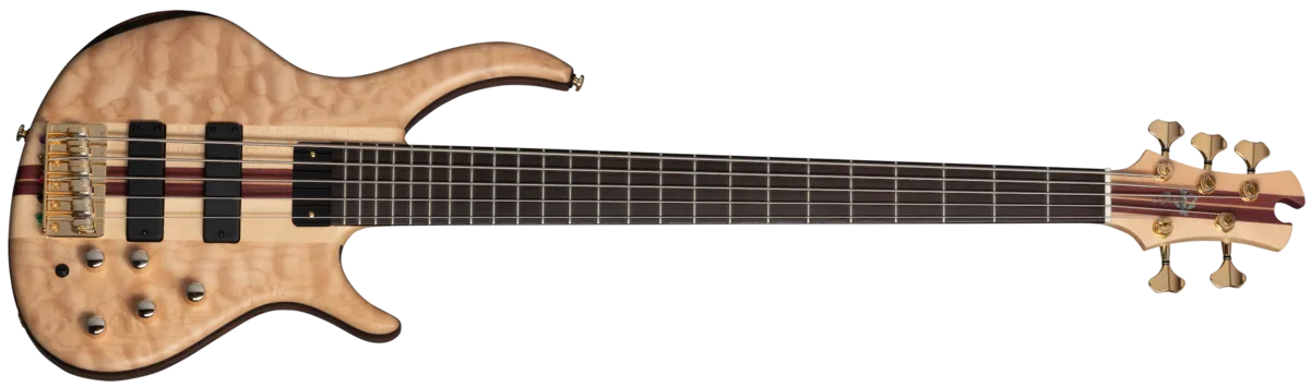 Reintroducing the Tobias Classic V. Tobias basses deliver exceptional clarity in the low end, punchy, articulate midrange, and sweetness in the high frequencies. Uncompromising performance and tone are what the Tobias Classic V is all about. Crafted from the finest tonewoods, the Classic V features a 34" scale, 5-piece stringer neck through-body made from hard maple and purpleheart, and 3-layer body wings made from walnut, wenge, and capped with a highly figured quilted maple cap. The neck has a wenge fretboard and 24 jumbo frets, a bone nut, the easy-playing Tobias Asym ™ profile, and is equipped with Gotoh® tuners. A Babicz® bridge ensures exceptional action and intonation adjustability. Two active Bartolini® humbucking pickups, an 18V preamp, and Volume, Bass, Mid, Treble, and Blend controls, along with a Mid Frequency switch, provide all the control you need to dial up your ideal bass tone. A Tobias premium gig bag is also included.