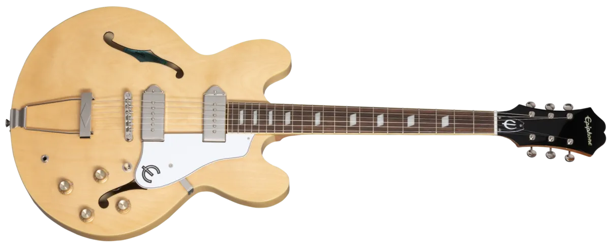 Since 1961, the legendary Casino ™ has been Epiphone's best-selling archtop and a rock n' roll standard. First introduced in 1961, the Casino was just one of several new thinline archtops designed and produced at the company's adopted new factory in Kalamazoo. Michigan that it shared with one-time competitor and new partner, Gibson. The Casino was adopted by Keith Richards of The Rolling Stones who used a Casino to record the demo for "Satisfaction" at Chess Records in Chicago. Howlin' Wolf took a Casino on his first tour of the UK, appearing on Thank Your Lucky Stars. Shortly afterward, John Lennon and George Harrison bought Casinos for the Beatles' 1966 world tour. Featuring Dogear PRO P-90 pickups and 5-ply maple body. Available in Natural and Vintage Sunburst.