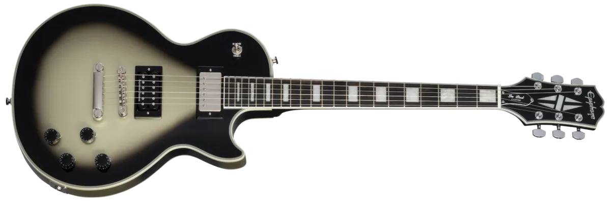 This model from the Adam Jones Les Paul Custom Art Collection features Korin Faught's "Sensation" on the back. It is also an exceptional instrument for your next musical masterpiece. It has a bound mahogany body with a maple cap, a three-piece bound maple neck with an Adam Jones Custom profile, and an ebony fretboard. It is equipped with a reverse-mounted Epiphone ProBucker™ Custom humbucker™ in the neck position and a Seymour Duncan® Distortion in the bridge; both are wired to CTS® potentiometers and Orange Drop® capacitors. A Marquee Back Plate with the artist's name and the name of the artwork is also included. Finished in Antique Silverburst as an homage to Adam's beloved original Silverbust 1979 Gibson® Les Paul Custom, a Protector hardshell case is also included.