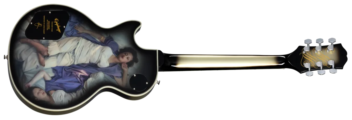 The Epiphone Adam Jones Art Collection consists of seven Silverburst Les Paul ™ Custom models, each featuring reproductions of different works of fine art on the back. Adam curated the featured artwork, and additional artwork, designed by artist Korin Faught, adorns the back of the headstock of each model. Five distinguished artists are featured in the collection, and only 800 guitars of each model will be produced. This unprecedented limited-edition collection brings Adam's love of art and music together.