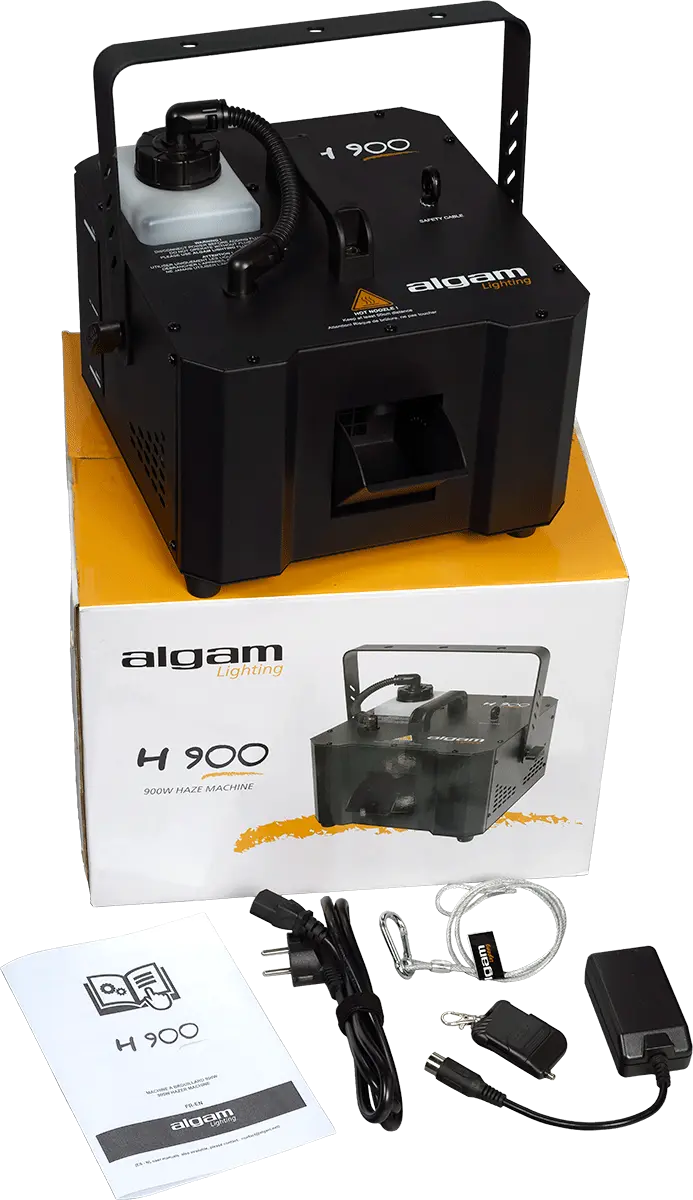 The H900 is a 900W haze machine that will enhance the effects of your light shows by producing a dense and steady haze. Its robust steel construction, large 1.2-litre tank, and record heat-up time of 40 seconds make it the ideal haze machine for private parties, clubs, and bars. The H900 offers different operating modes and numerous settings (trigger intervals and durations, auto timer, smoke volume output, fan speed), all DMX controllable or from the control screen with LCD display. You can also trigger haze remotely using the included wireless remote control. For an optimal result, Algam Lighting recommends using haze fluid.